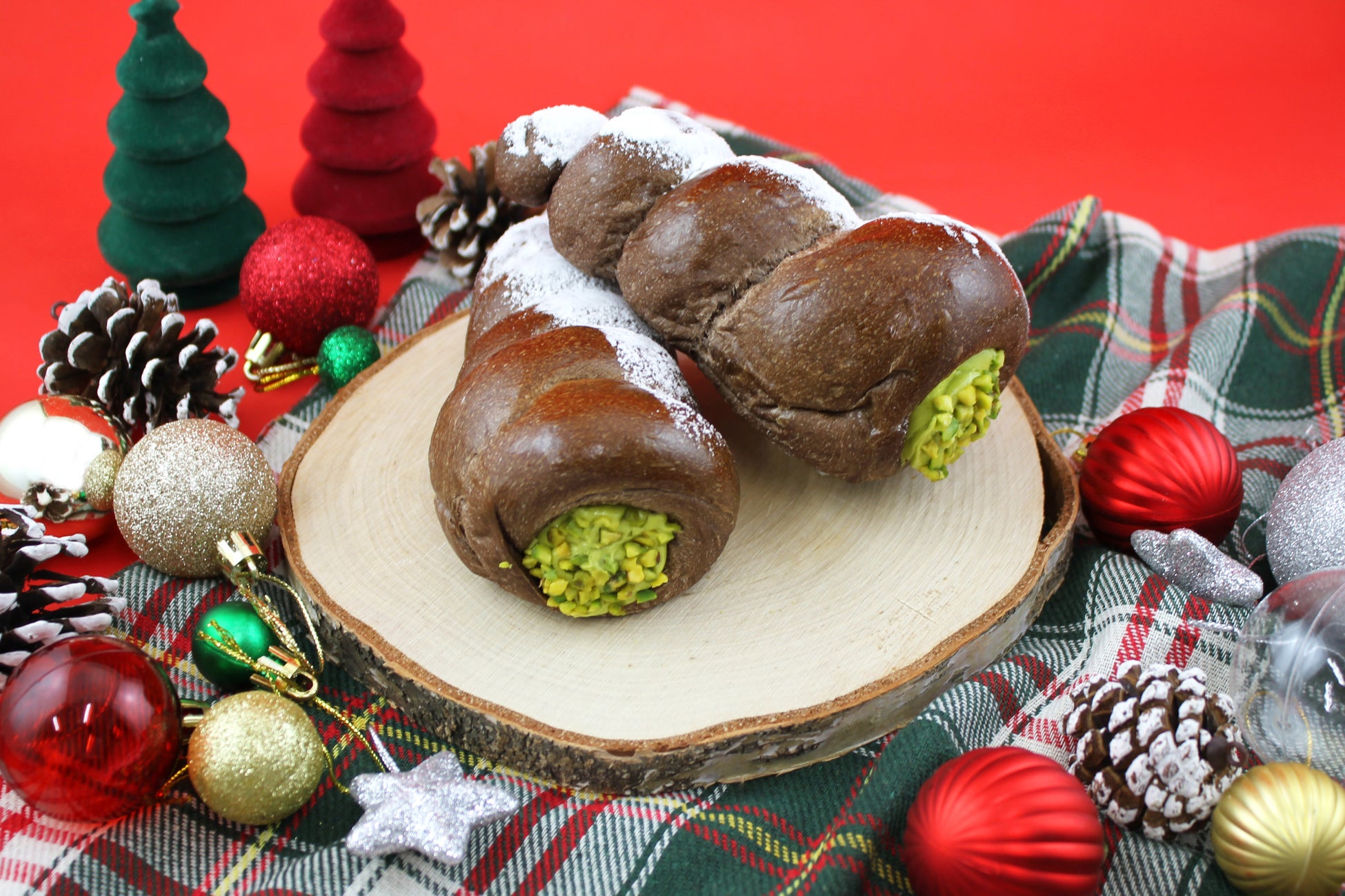 チョコ生地のコルネに、ピスタチオクリームをつめこみました。ホリデーシーズンを彩るピスタチオ。その鮮やかな緑とコク深い風味が、特別な気分を高める一品です。