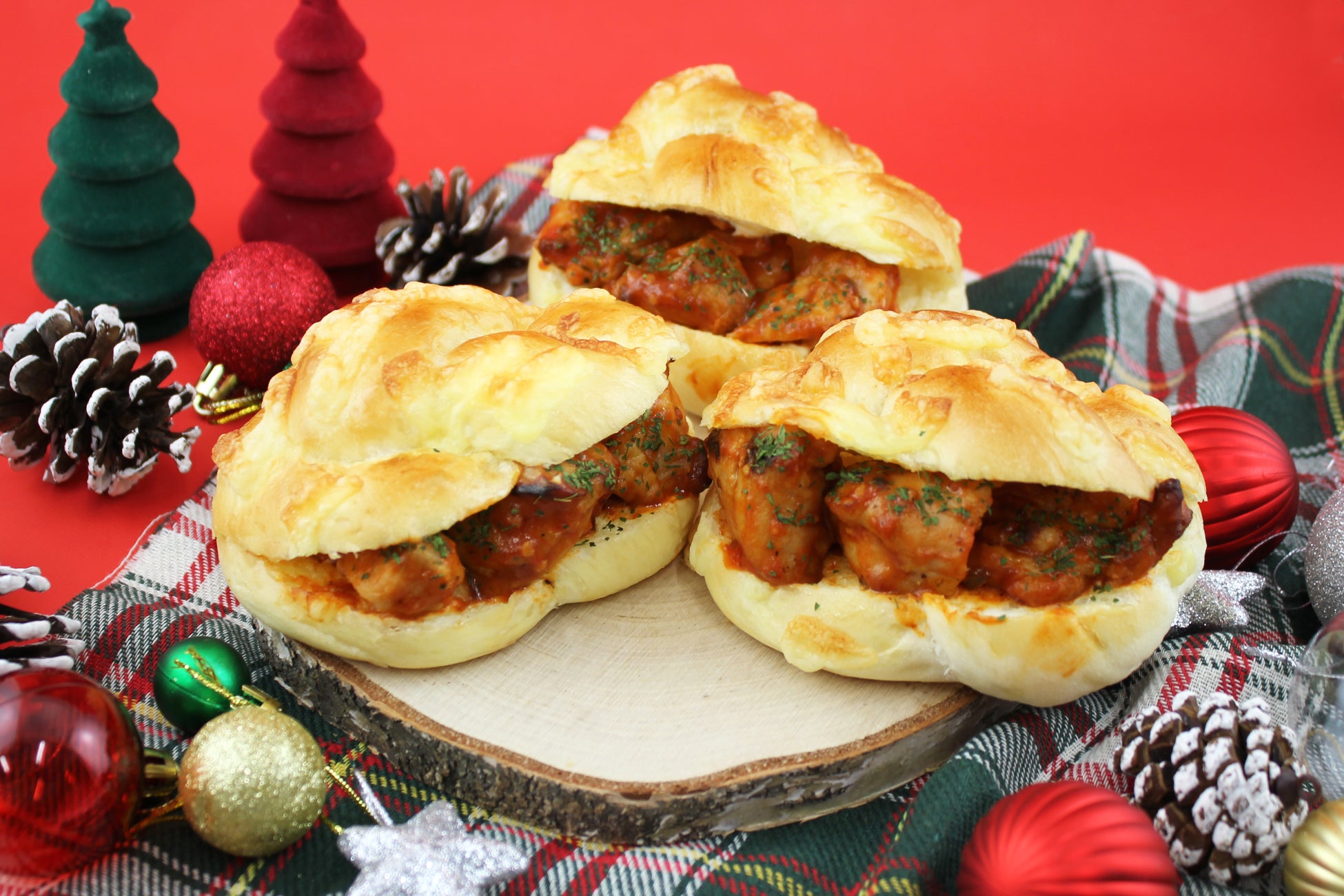 ふんわりとした食パン生地に、トマトガーリックソースを絡めたチキンをサンドしました。食欲そそるガーリックの香りに、ごろっと入ったチキンが食べ応え抜群の一品です。