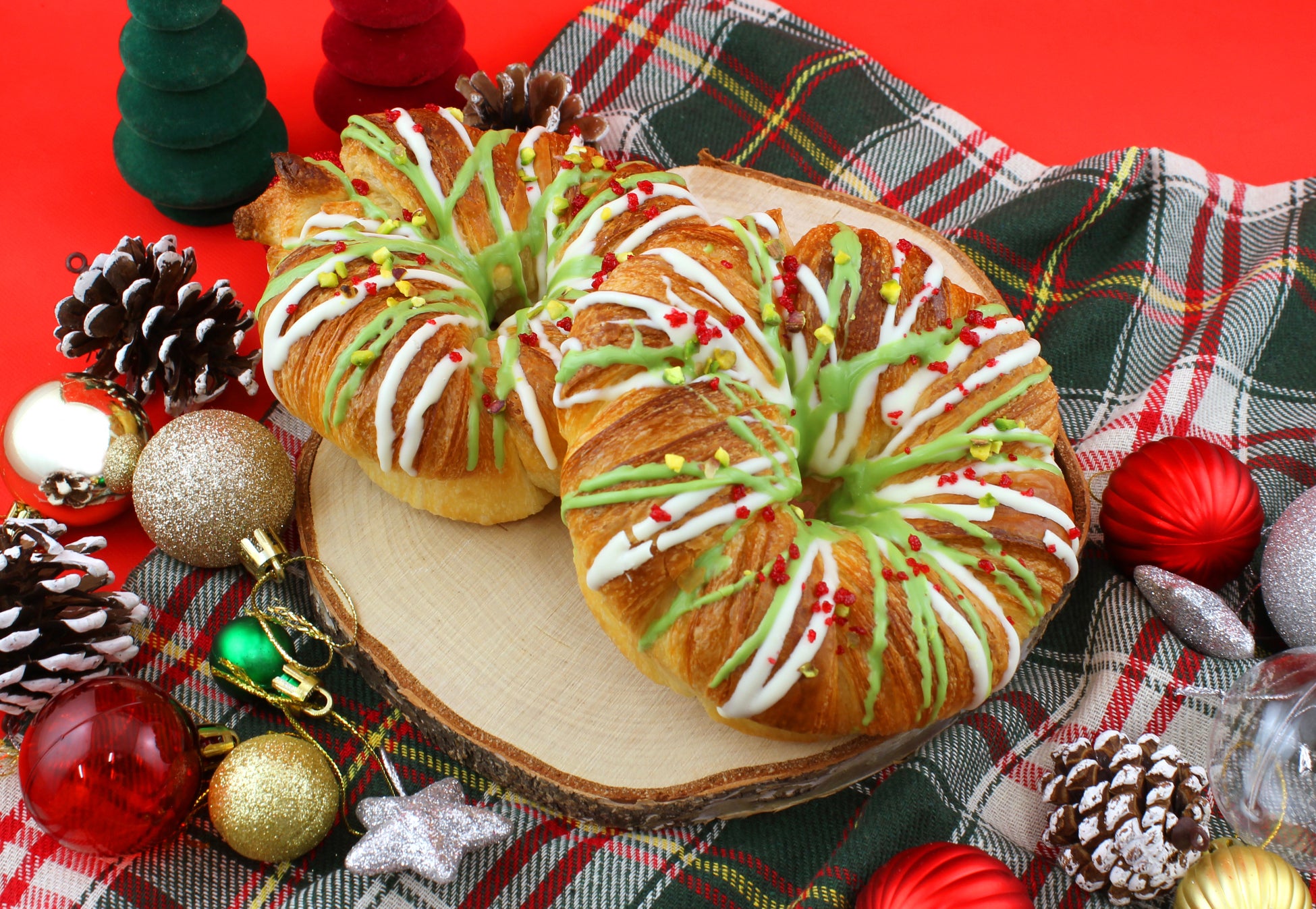 クロワッサン×ベーグルのハイブリッドな生地を焼き上げ、ラズベリー顆粒とピスタチオをトッピングしました。リースを思わせるポップな見た目に、パリッともっちり食感!見ても食べてもハッピー広がるホリデースイーツです♪