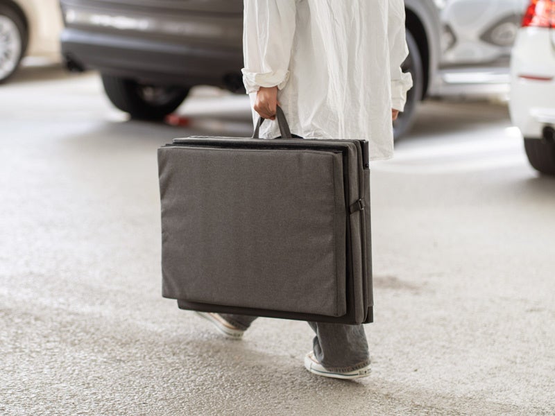 三つ折り構造で厚さ13cmの薄型になるため保管場所に困りません。片手で持ち運べるコンパクト設計により、お部屋の好きな場所からキャンプ場までどこでも手軽に持ち運べます。