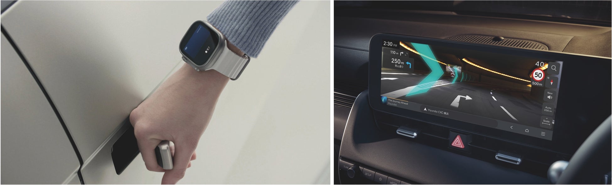 「The new IONIQ 5」のLounge/Lounge AWDには、ビルトインフロントカメラとリヤビューカメラを活用したドライブレコーダー機能が搭載され、映像と共に音声、位置情報も記録できる仕様となりました。また、車両前方の映像をセンターのインフォテインメント画面に映し、ルート案内に重ねて表示するARナビを搭載することで、ナビゲーションがより直感的でわかりやすく進化。さらに、スマートフォンやスマートウォッチが車のキーとして解錠・施錠、車両の始動に使えるデジタルキー機能を採用することで、家族や友人とも対面することなくキーをシェアできるようになりました。