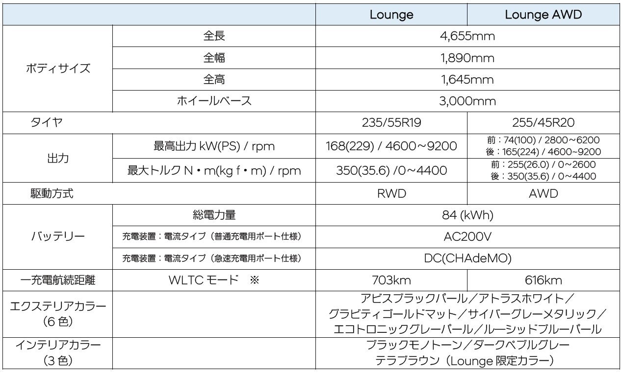 ※Voyage / Loungeが 703km、Voyage AWDモデルは648km、Lounge AWDモデルは 616km