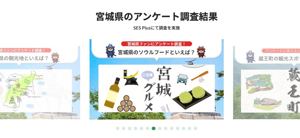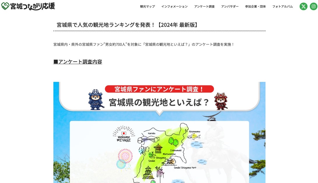 地域の魅力発信や再発見を目的に、宮城県に関するアンケート調査を実施。結果を公式サイトに掲載し、県内外の人々からの意見や感想を集め、今後の地域活性化への参考としました。