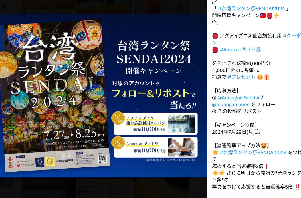 ・アクアイグニス仙台様:「震災支援への恩返し!『台湾ランタン祭SENDAI2024』を盛り上げたい」プロジェクト。( https://camp-fire.jp/projects/781001/view )