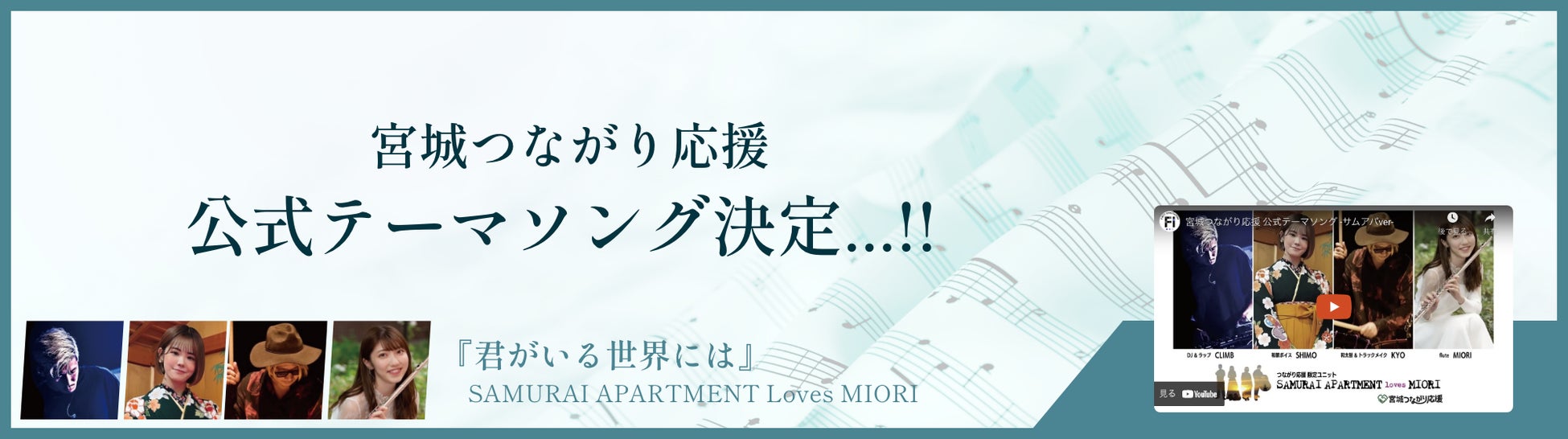宮城を代表するアーティスト「SAMURAI APARTMENT」とフルート奏者「小畑 実織」を迎え、公式テーマソング「君がいる世界には」を「SAMURAI APARTMENT Loves MIORI」名義で制作。公式PV「宮城つながり応援 公式PV -サムアパver-」をリリースし、音楽を通じて宮城の魅力を広く伝えました。