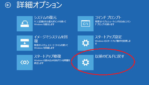 Step2:「トラブルシューティング」を開いて「詳細オプション」を選択し、「以前のビルドに戻す」をクリックします。