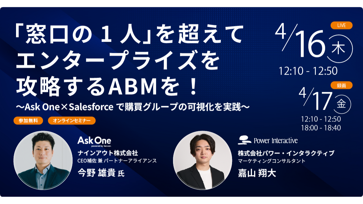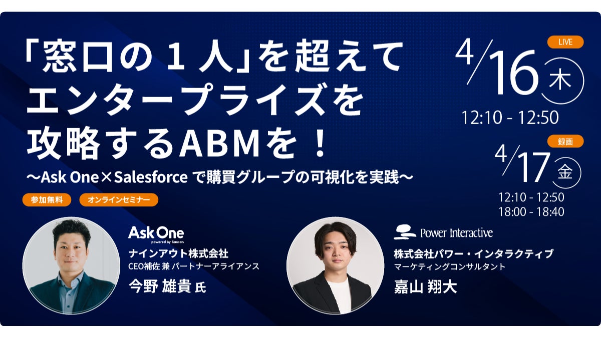 株式会社パワー・インタラクティブは、無料ウェビナー『「窓口の1人」を超えてエンタープライズを攻略するABMを!〜Ask One×Salesforceで購買グループの可視化を実践〜』を、4月16日にライブ開催、4月17日に録画配信を行います。