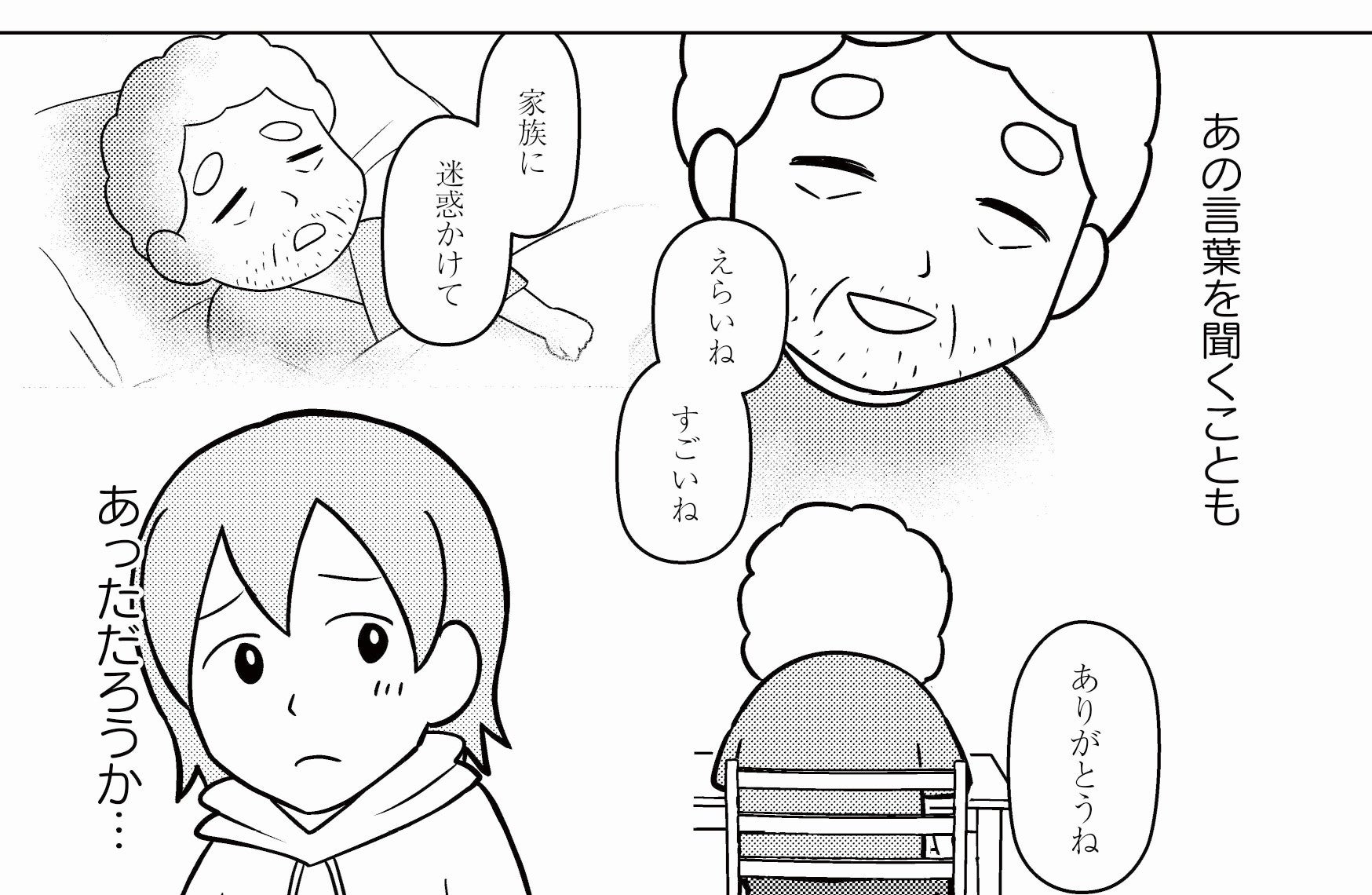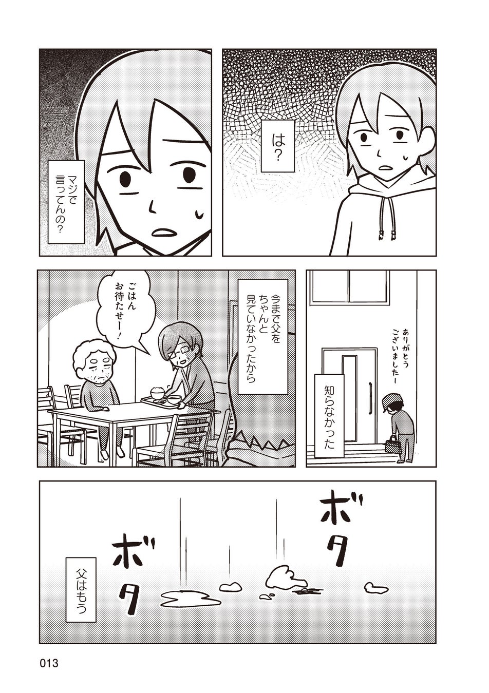 ある日突然、父が認知症と診断された。子供のころから怒鳴ってばかりでろくに構ってもくれなかった父のことは嫌いだった。だから認知症も自分には関係ないと、関わるつもりはなかった…。しかし、暮らしていく中で知らなかった父の一面が現れてくる。「ありがとう」「ごめんね」。あの頃に聞きたかった言葉を投げかけてくる父。しかし、これは本心なのか、認知症の症状が言わせているのか…。分からないまま、父との関係に悩み、苦しみ、葛藤する――。
