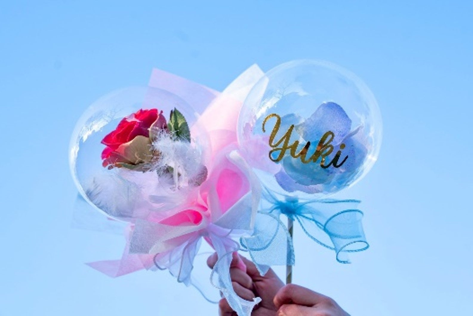 バルーンの中に羽や花びらなど好きなものを入れて、好きな色のリボンを付けたら完成です!