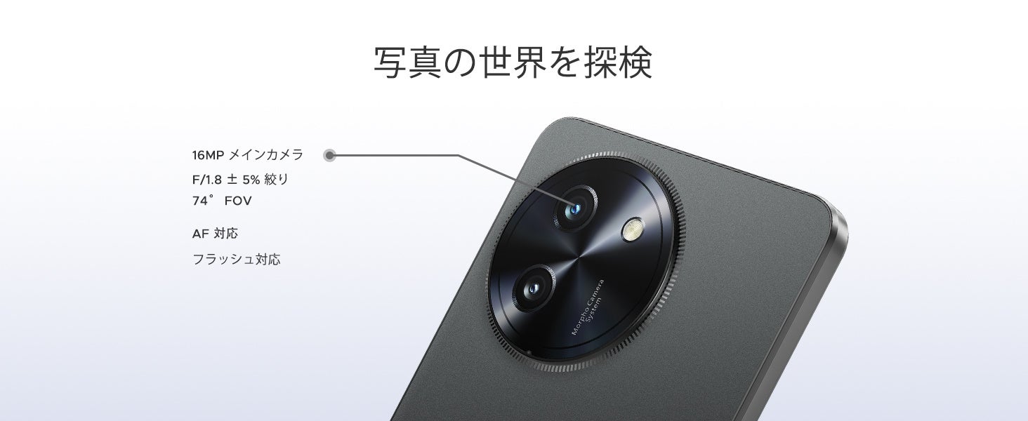 背面 16MP(AI 補正対応)、前面 8MP。AI 補正機能で日常撮影をサポート。