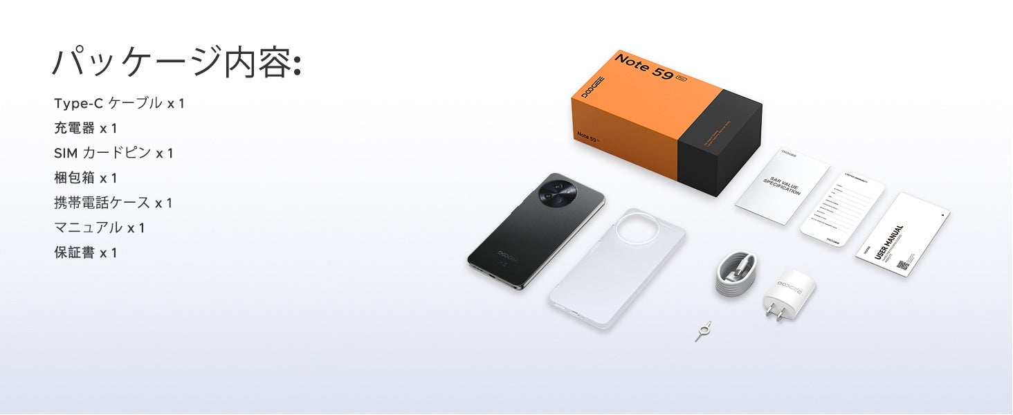 付属品として、充電器、Type-C ケーブル、保護フィルム(貼付済)、保護ケース、説明書、SIM 取り出しピンを同梱。