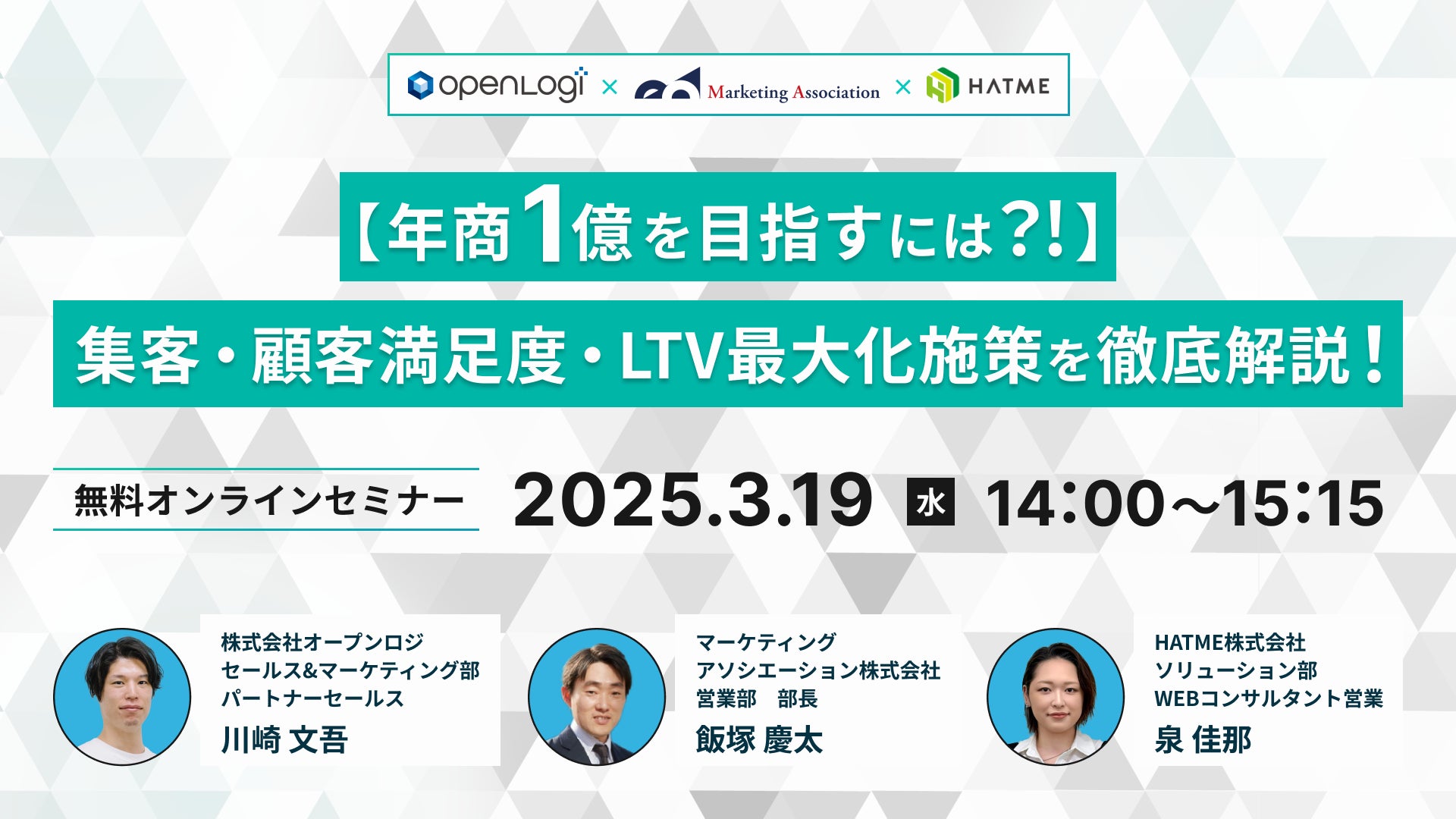 ECサイトの運営代行サービスを提供しているマーケティングアソシエーション株式会社(本社:東京都台東区 代表取締役:中園広和、以下当社)は、2025年3月19日(水)に、ウェブセミナー「【年商1億を目指すには?!】集客・顧客満足度・LTV最大化施策を徹底解説!」を、株式会社オープンロジ、HATME株式会社と共催いたします。