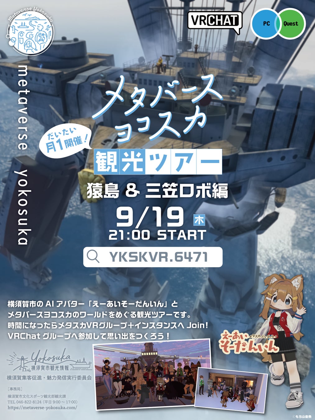 このたび、横須賀市が試験運用しているAIアバター「えーあいそーだんいん」と、市の職員が「メタバースヨコスカ」のワールドをご案内するメタバース観光ツアーを開催します。