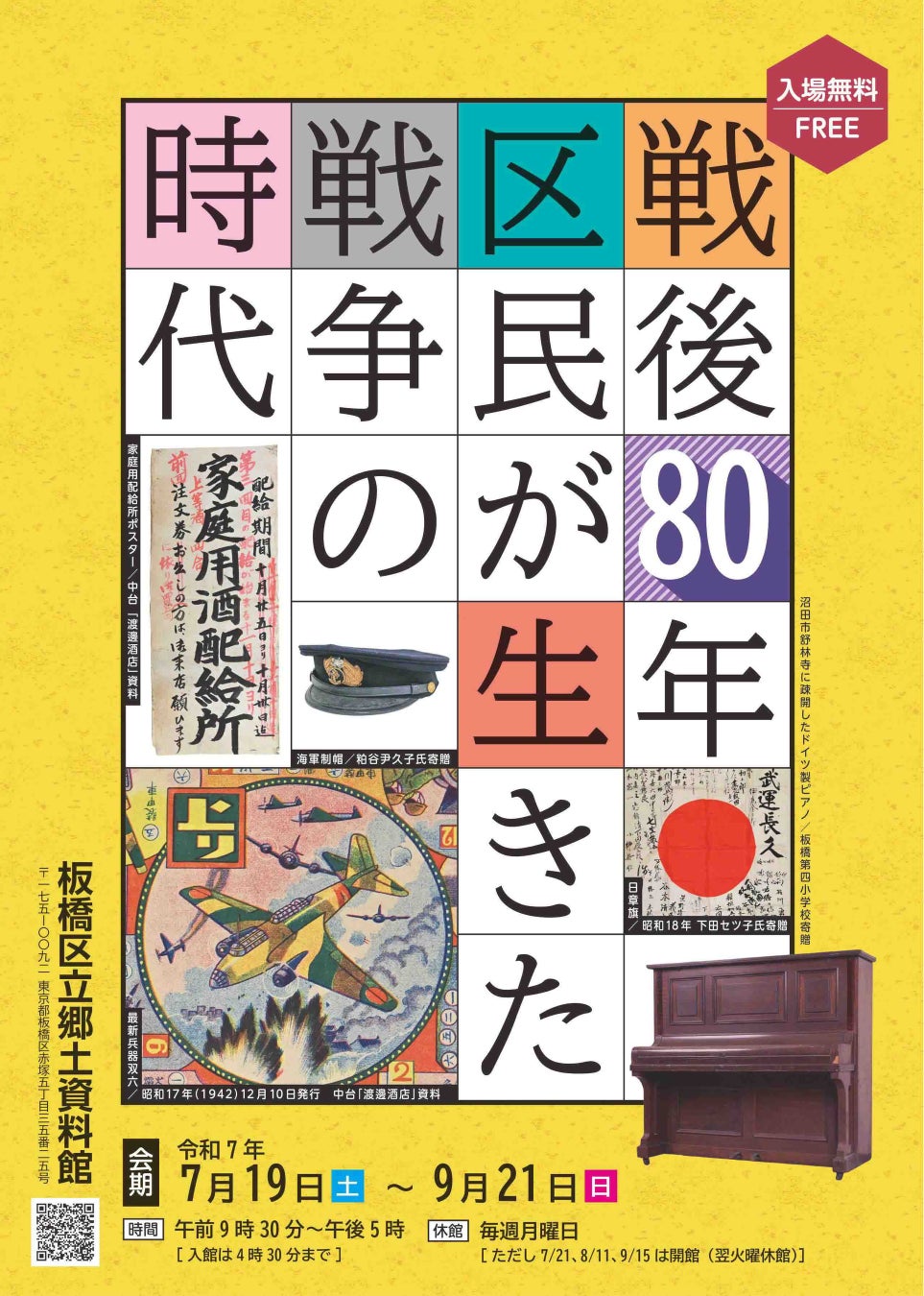 板橋区立郷土資料館において、令和7年7月19日(土)から9月21日(日)まで、展示「戦後80年 区民が生きた戦争の時代」を開催します。