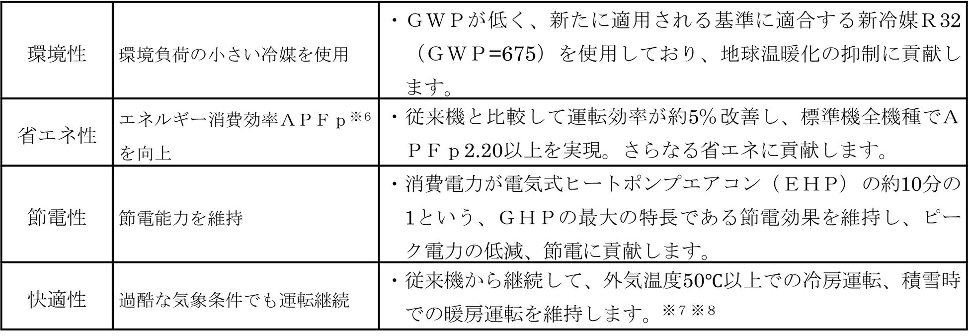 また、生成AIの普及やデータセンターの増加により、今後さらに電力需要の増加が見込まれる中、社会的に「節電と省エネ」への需要が高まっています。本製品は、消費電力が電気ヒートポンプエアコン(EHP)の約10分の1※3というGHP最大の特長である節電能力を維持しながら、従来機と比較して運転効率を約5%改善することで、より一層の省エネルギー化を実現しました。