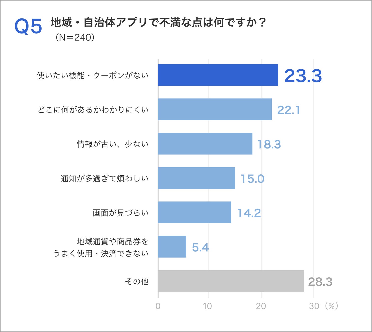 他方、利用者が不満を感じている点は、「その他」(28.3%)、「使いたい機能・クーポンがない」(23.3%)、「情報が古い/少ない」(18.3%)などとなっており、地域DXアプリにはまだまだ改善の余地が多いことがうかがえます。