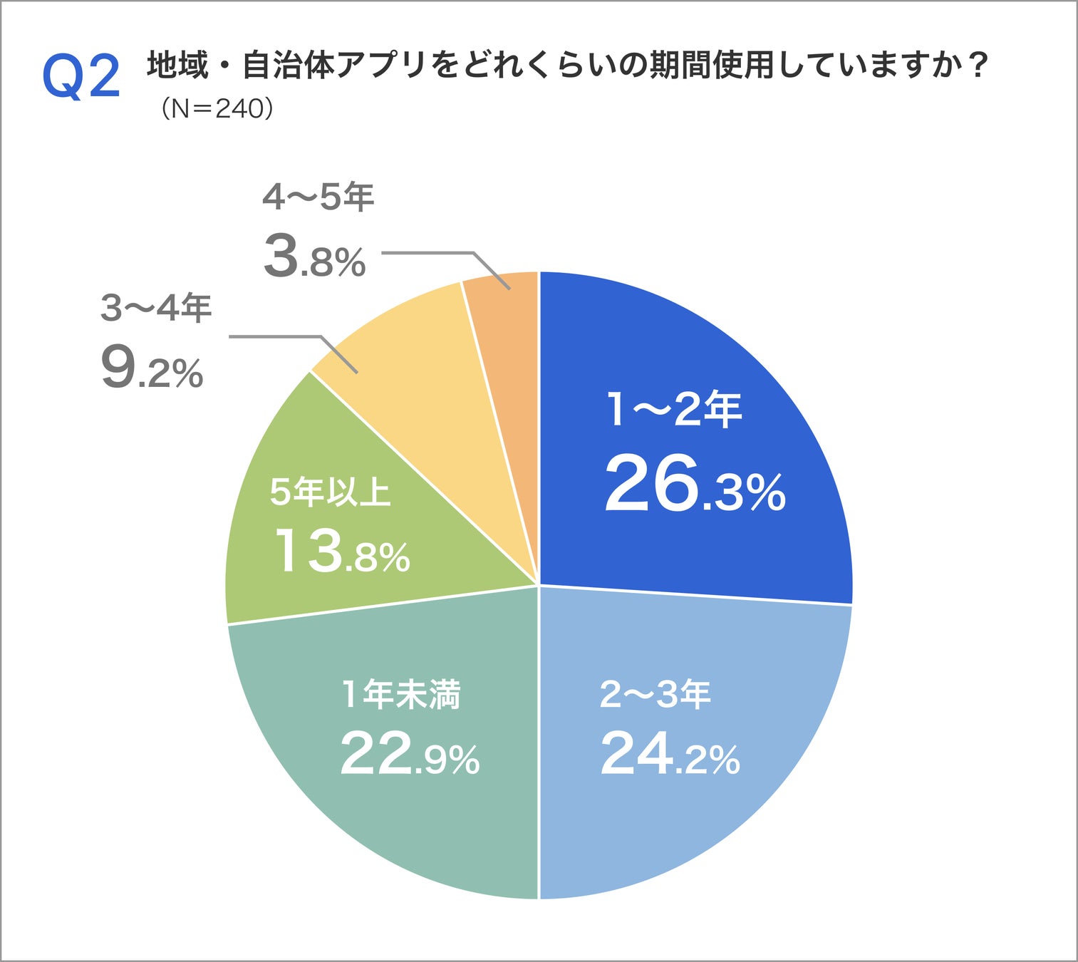 地域DXアプリの利用期間に関しては、利用者の約23%が「1年未満」、約27%が「1年〜2年未満」、約24%が「2年〜3年未満」という結果が得られました。直近3年以内に利用し始めたユーザーが多いことから、直近でのデジタルシフトがかなり加速していることがわかります。
