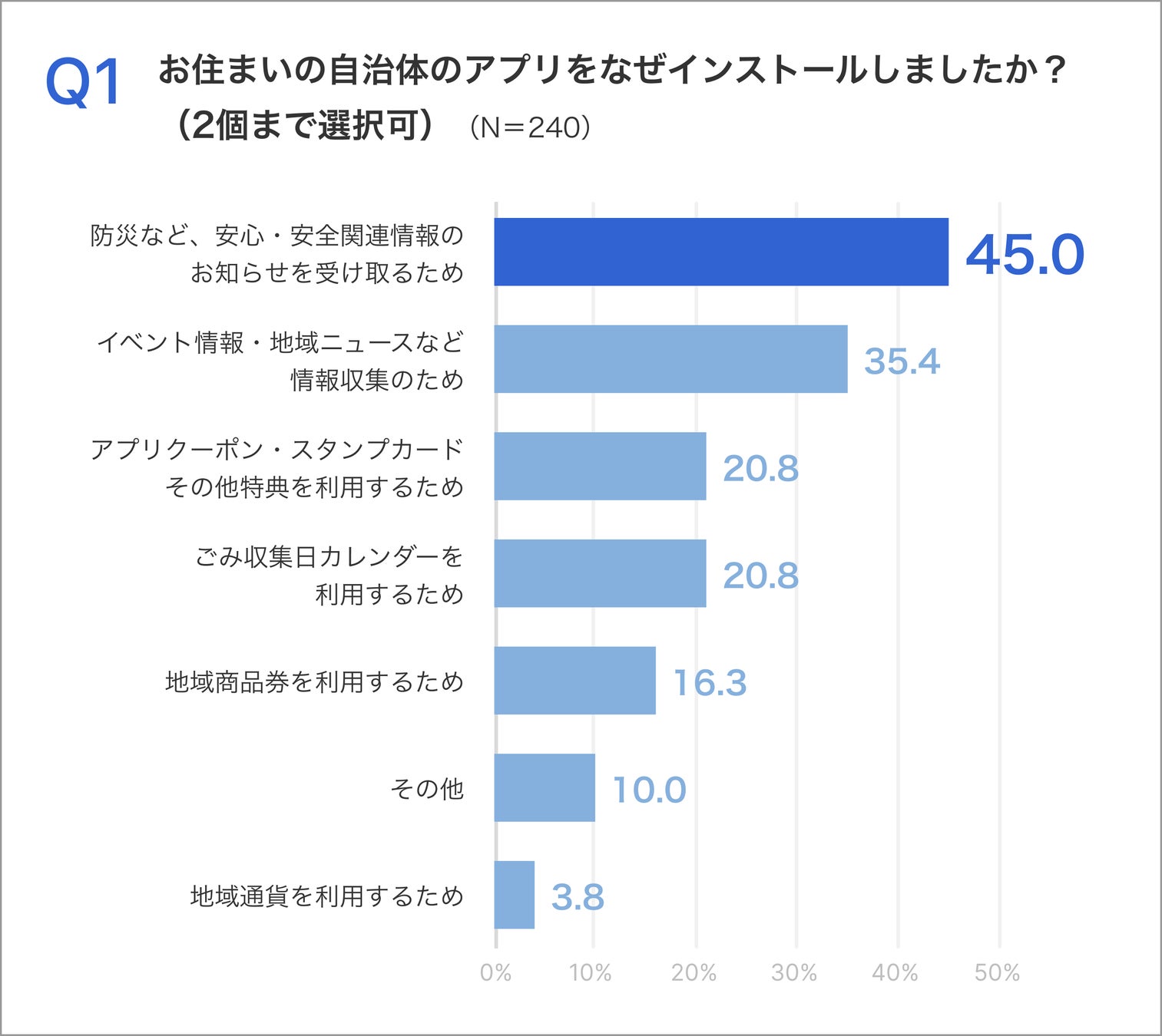 地域DXアプリをインストールした目的として最も多いのは「防災情報」であり、全体の約45%がこの目的でアプリをインストールしていました。