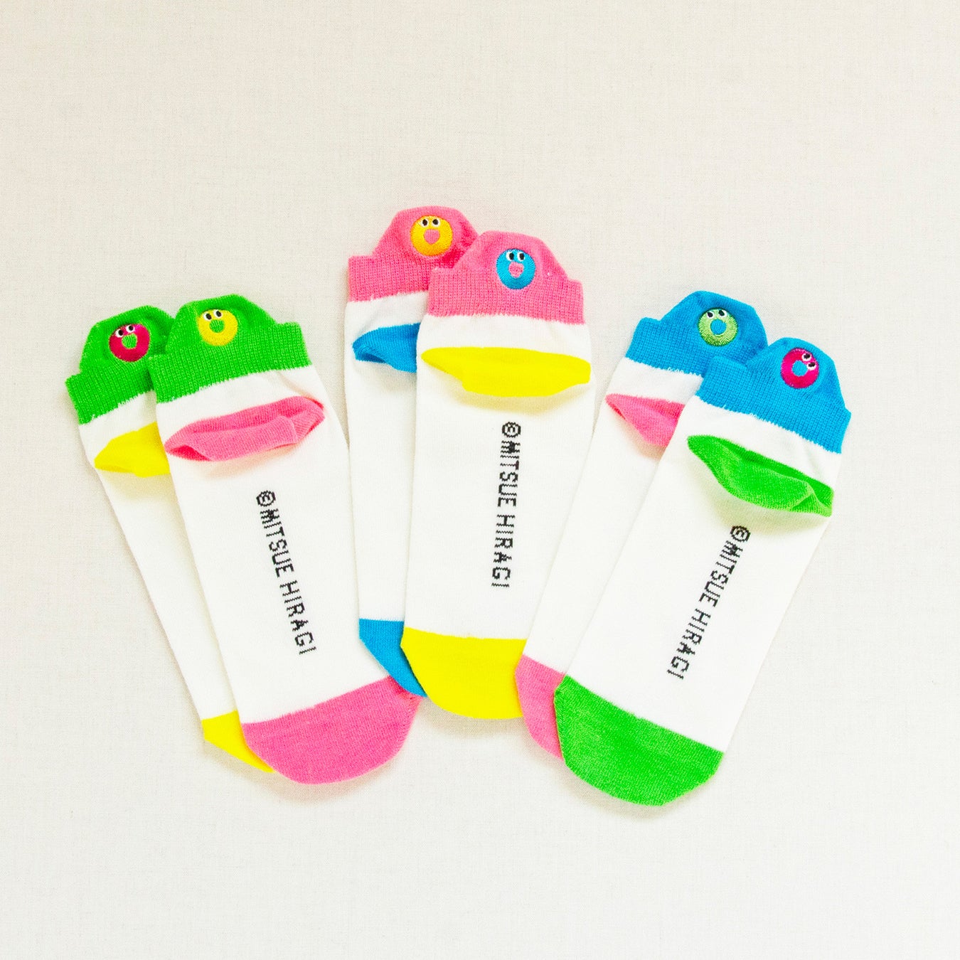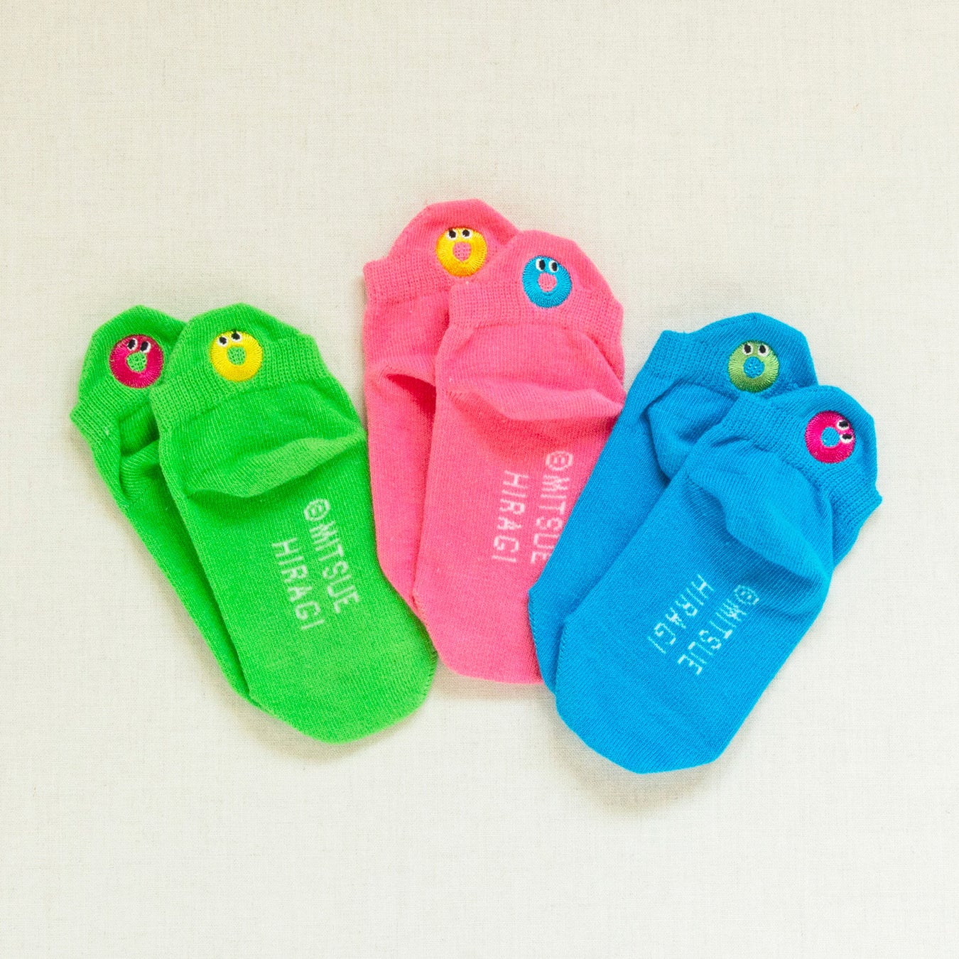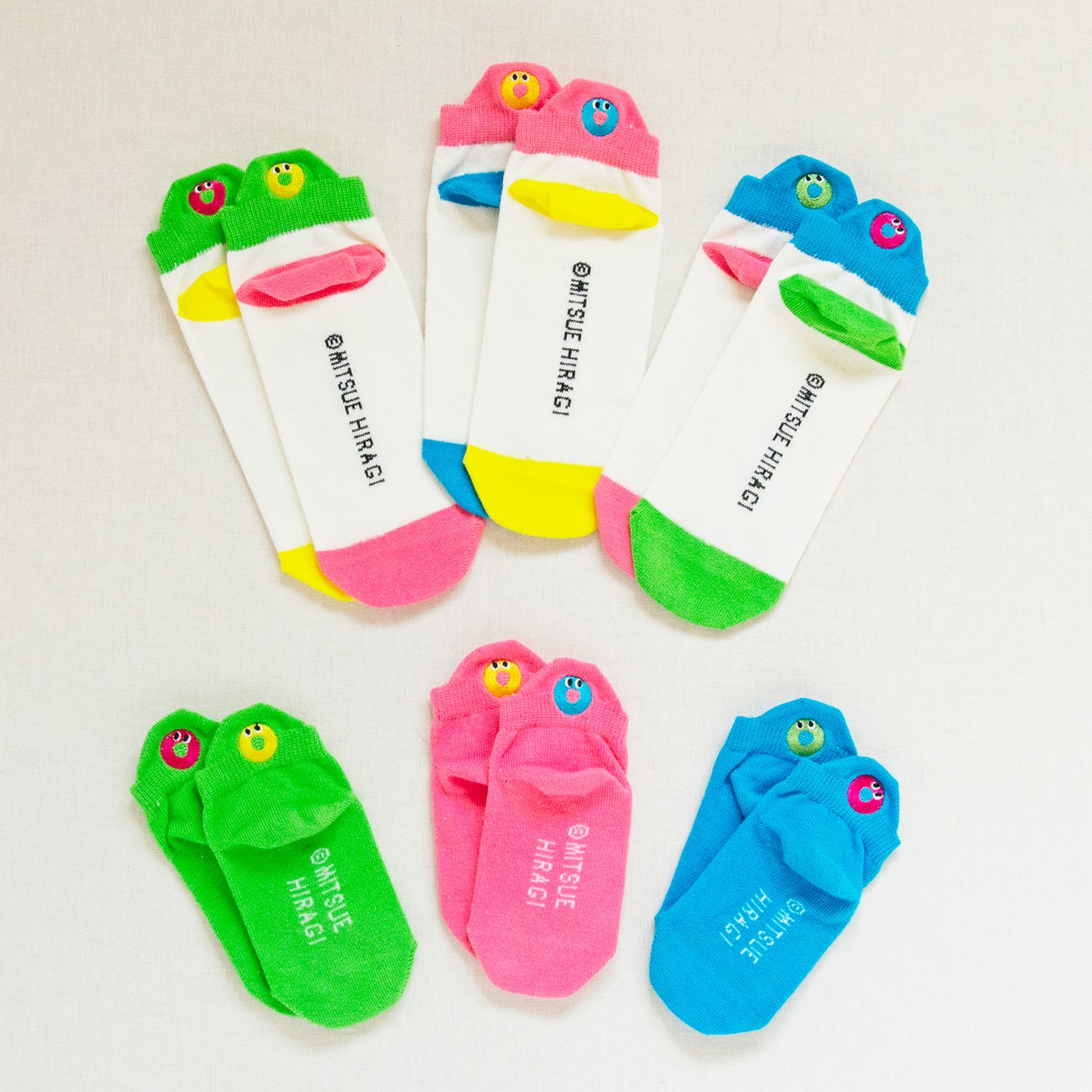 こちらはレディースサイズ。キッズサイズと同様に、絵本をイメージするピンク、ブルー、グリーンの3色を基調に、左右それぞれ違う色と表情の「ころりん」がかかとに刺繍されています。また、つま先とも違う色になっている遊び心満載のポップなデザイン。キッズサイズと揃えて、親子で一緒に楽しんでいただきたいソックスです。