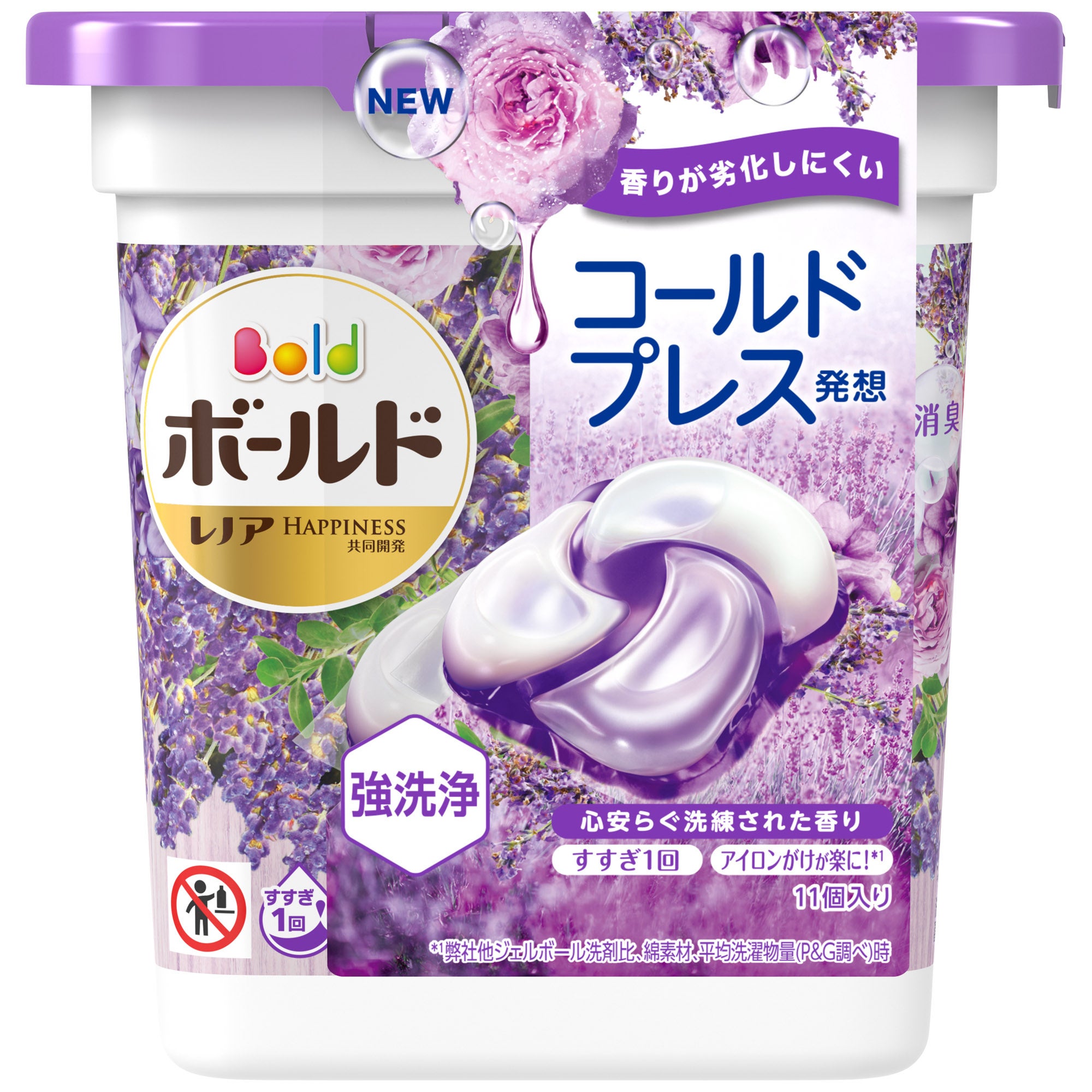 今回のリニューアルでは、ピンクの「ボールド ジェルボール4D 癒しのプレミアムブロッサムの香り」、ブルーの「ボールド ジェルボール4D 爽やかフレッシュフラワーサボンの香り」に加えて、新香調の「ラベンダー&フローラルガーデンの香り」を新発売し、消費者の幅広い香りのニーズに対応します。「ラベンダー&フローラルガーデンの香り」は、100%新鮮な花のエッセンスを配合し*1、心安らぐ洗練された香りが特長です。