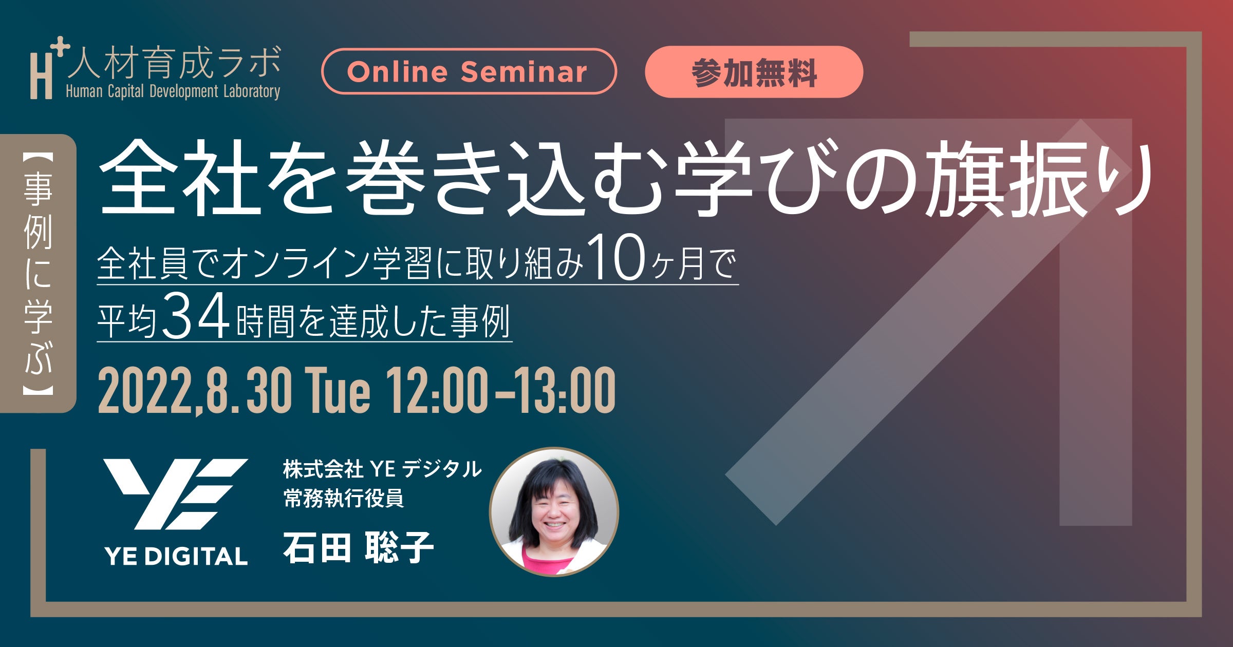 インターネットでの学びや教育を起点とした社会変革を行う株式会社Schoo(本社:東京都渋谷区、代表取締役社長CEO:森 健志郎、以下「スクー」)が提供する法人向け研修サービス「Schoo for Business」は、人的資本経営や組織開発に関連する情報発信やイベントを開催する「人材育成ラボ(H+)」を運営しています。この度8月30日(火)に、10ヶ月間で全社員平均34時間の学習時間を達成した株式会社YEデジタルの事例を元に、学習する組織の仕組みづくりやその推進方法を学ぶウェビナーを開催します。講師には、同社常務執行役員で、「学びの旗振り」を実行・推進した石田 聡子氏をお迎えします。参加費は無料です。
