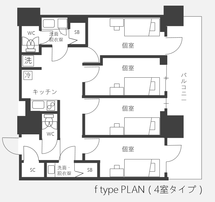 1人1室の室内に水回り等を備えた「個室型」と、4-5室ごとに水回りやミニキッチンを共有する「ユニット型」がございます。ユニット型の場合は、居室内に家具家電付きのため、契約開始後すぐのご入居も可能です。