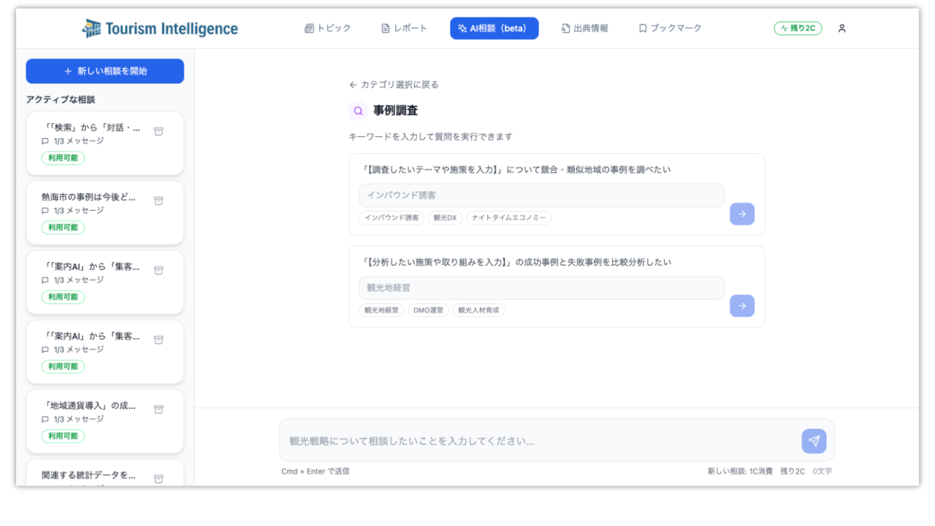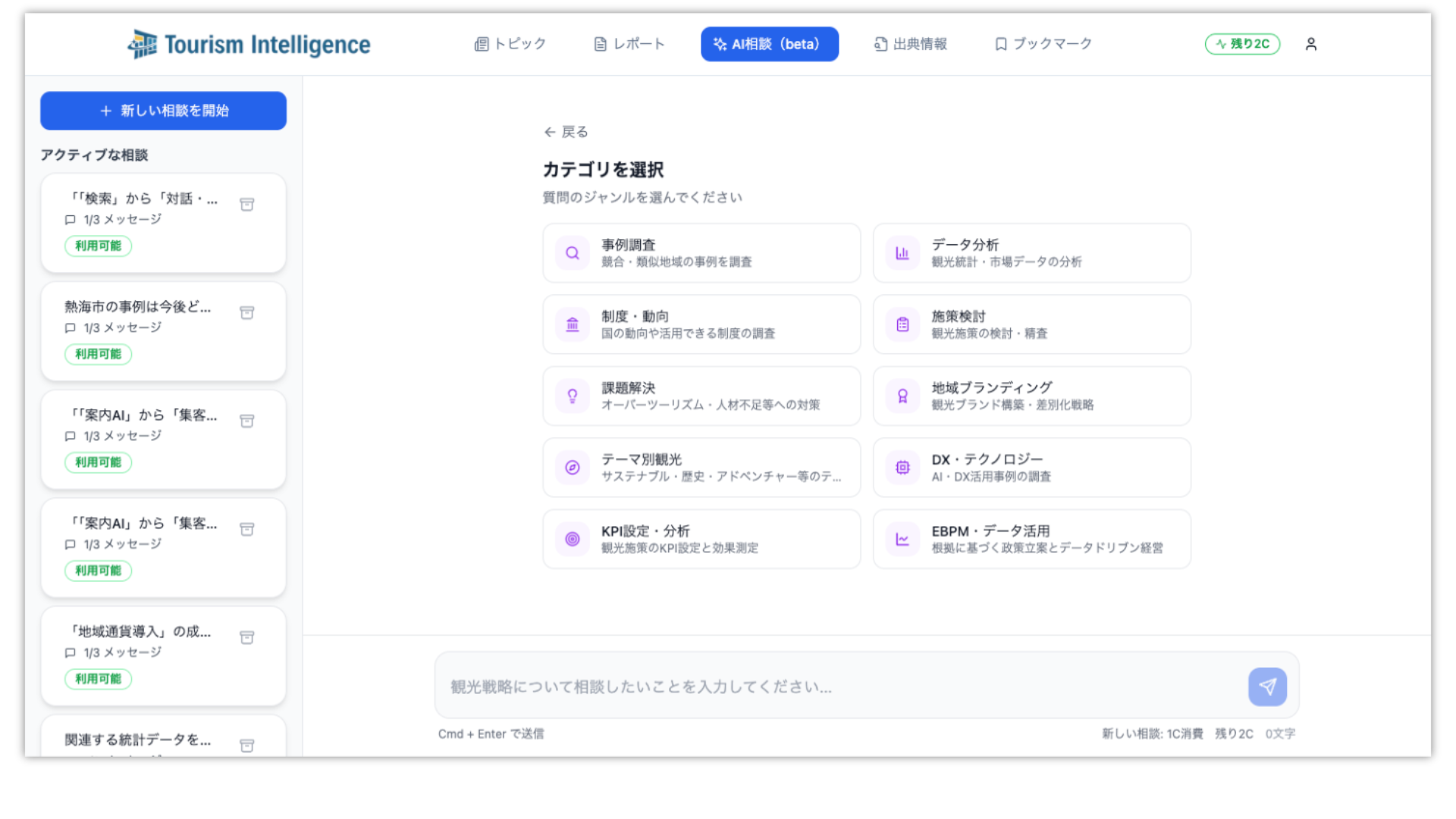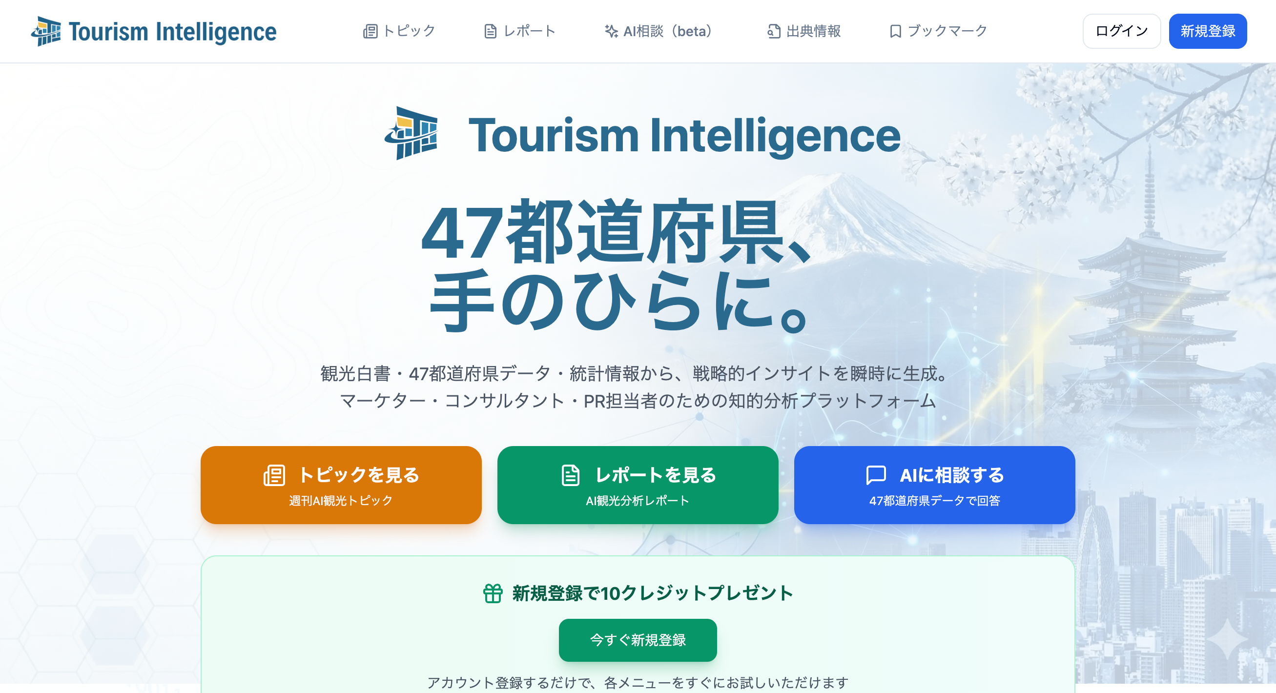 Tourism Intelligenceへの新規登録で10クレジットを無料プレゼントしています。AI相談をはじめ、各種機能をすぐにお試しいただけます。