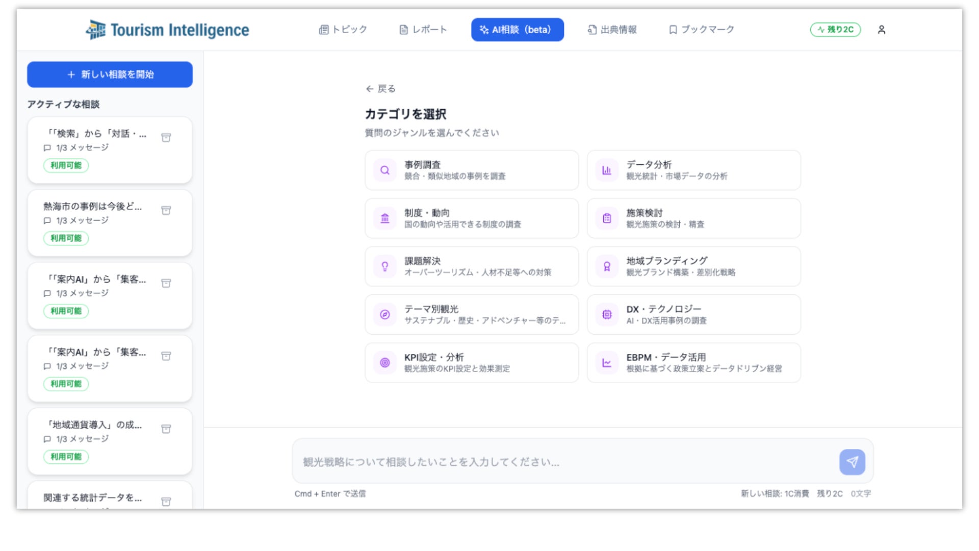 Tourism Intelligenceは、47都道府県の観光データと国の統計情報をAIが横断分析する、観光ビジネス向けの情報・分析プラットフォームです。「AI相談」「テーマ別AIレポート」「週次トピック配信」の3つの機能で、案件ごとのリサーチから提案資料のベース作成までを支援します。