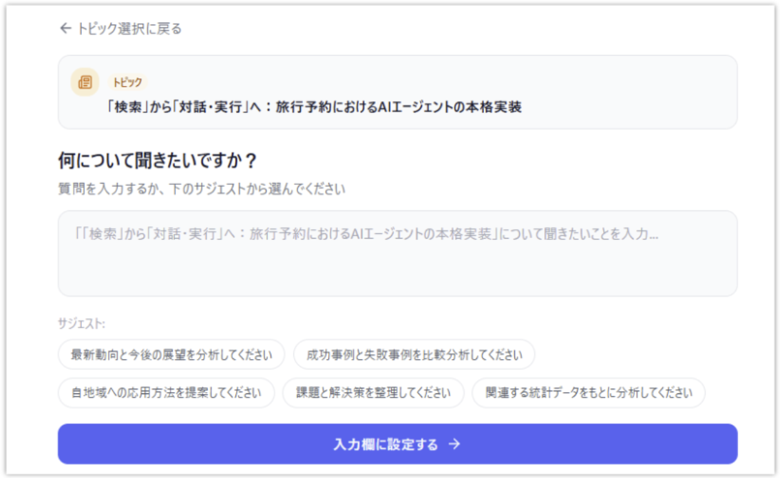 Tourism IntelligenceのAI相談は、サービス内に蓄積された観光データやインターネット上の情報を統合して分析し、さまざまなレポートや観光施策を提供する機能としてご好評をいただいています。一方で、求める回答を生成AIから引き出すのは指示文(AIプロンプト)を作るテクニックが求められる点が課題でした。