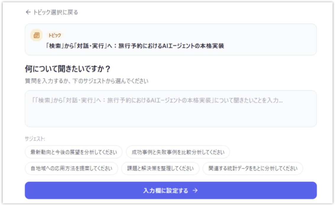 テーマや相談内容をクリックするだけでAIに相談しながら観光戦略を作成。「初めてで何をどう聞いていいか分からない」ような方でも簡単に観光戦略の作成や地域DMOに取り組めます。