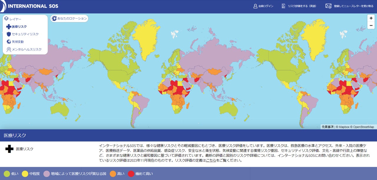 世界中で働く従業員の健康と安全を支えるインターナショナルSOS(日本法人本社:東京都港区 代表取締役 マーク・アタウェイ)は、このたびリスクマップの2024年版(日本語-デジタル版、PDF版、プリント版)をリリースしました。このマップは、組織とその従業員の皆様に世界中のリスクをより詳しくご理解いただけるよう構成されています。そして、ウクライナやイスラエル・ハマスのような紛争の影響なども反映させた、医療およびセキュリティのリスク評価をご提供しています。世界中のリスクの全体像を把握するためのツールとして、ぜひご活用ください。