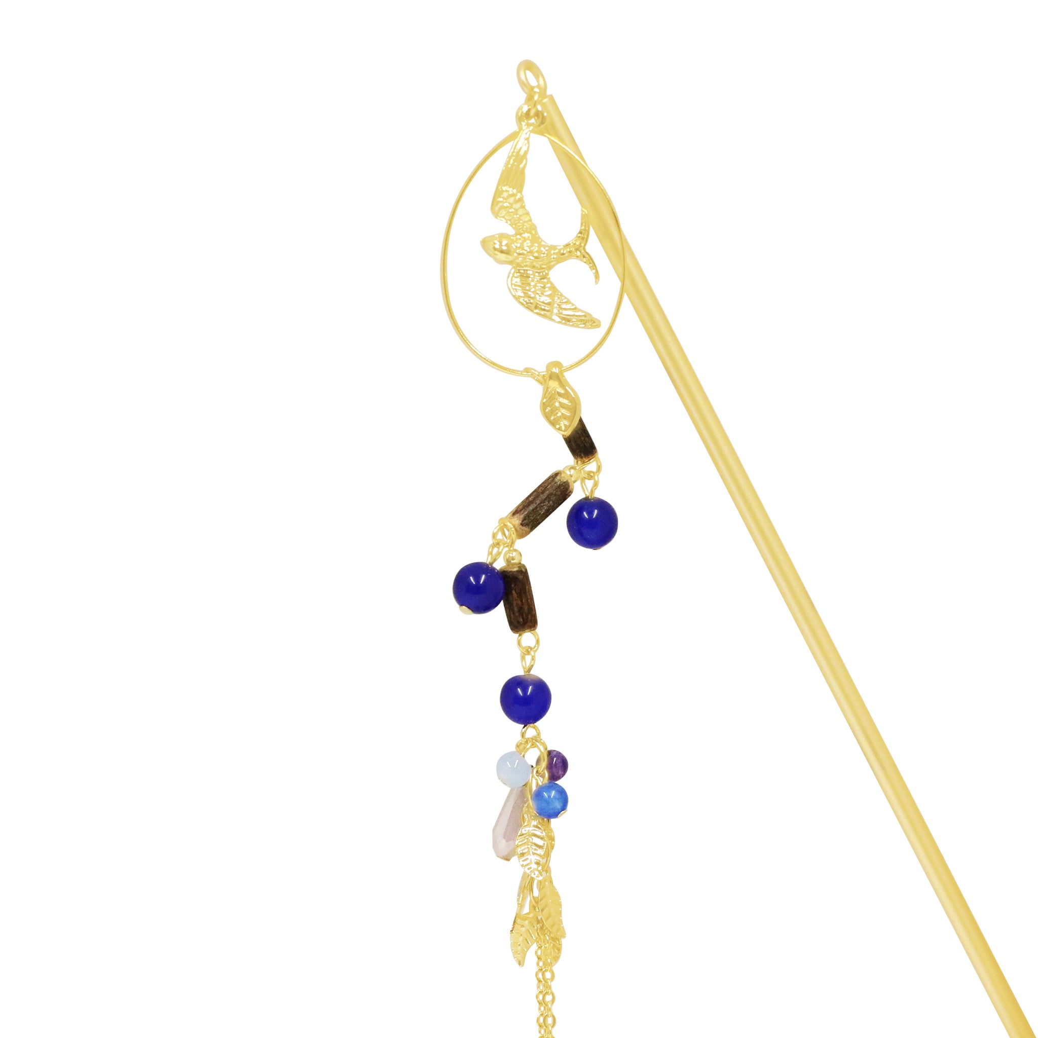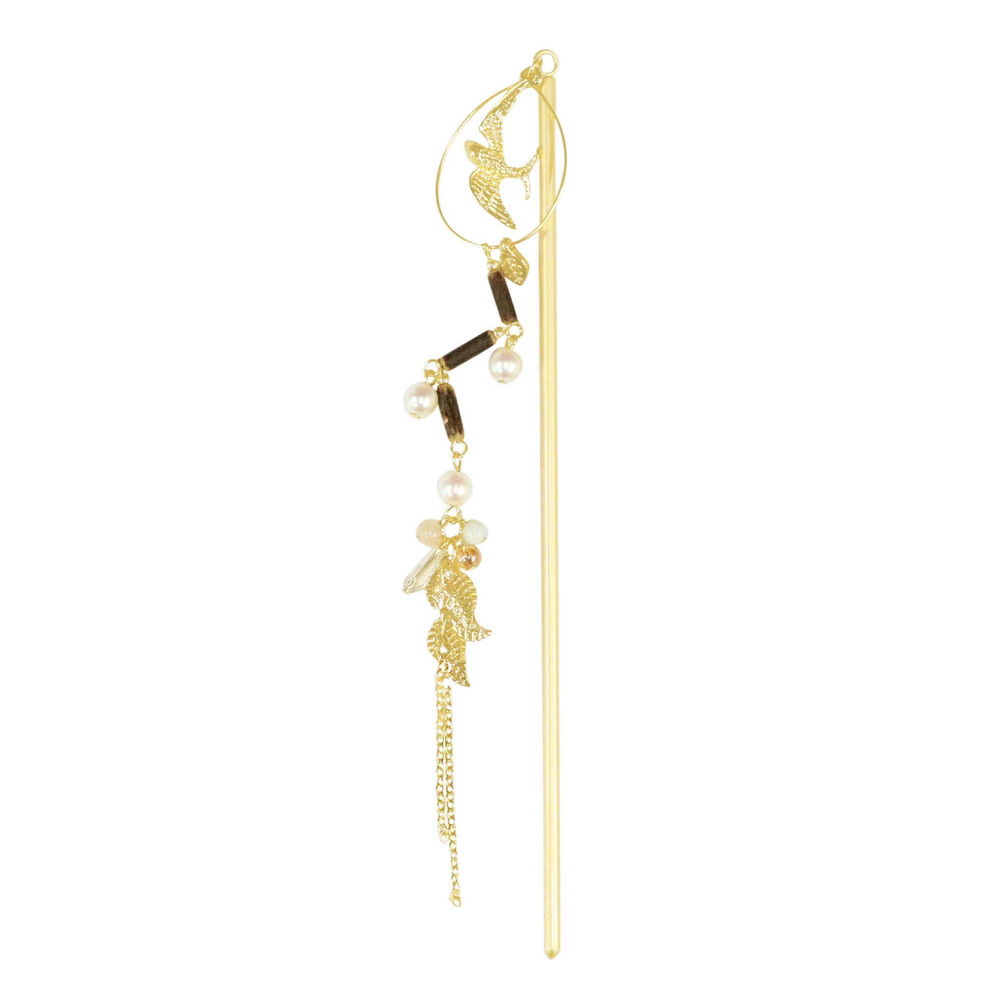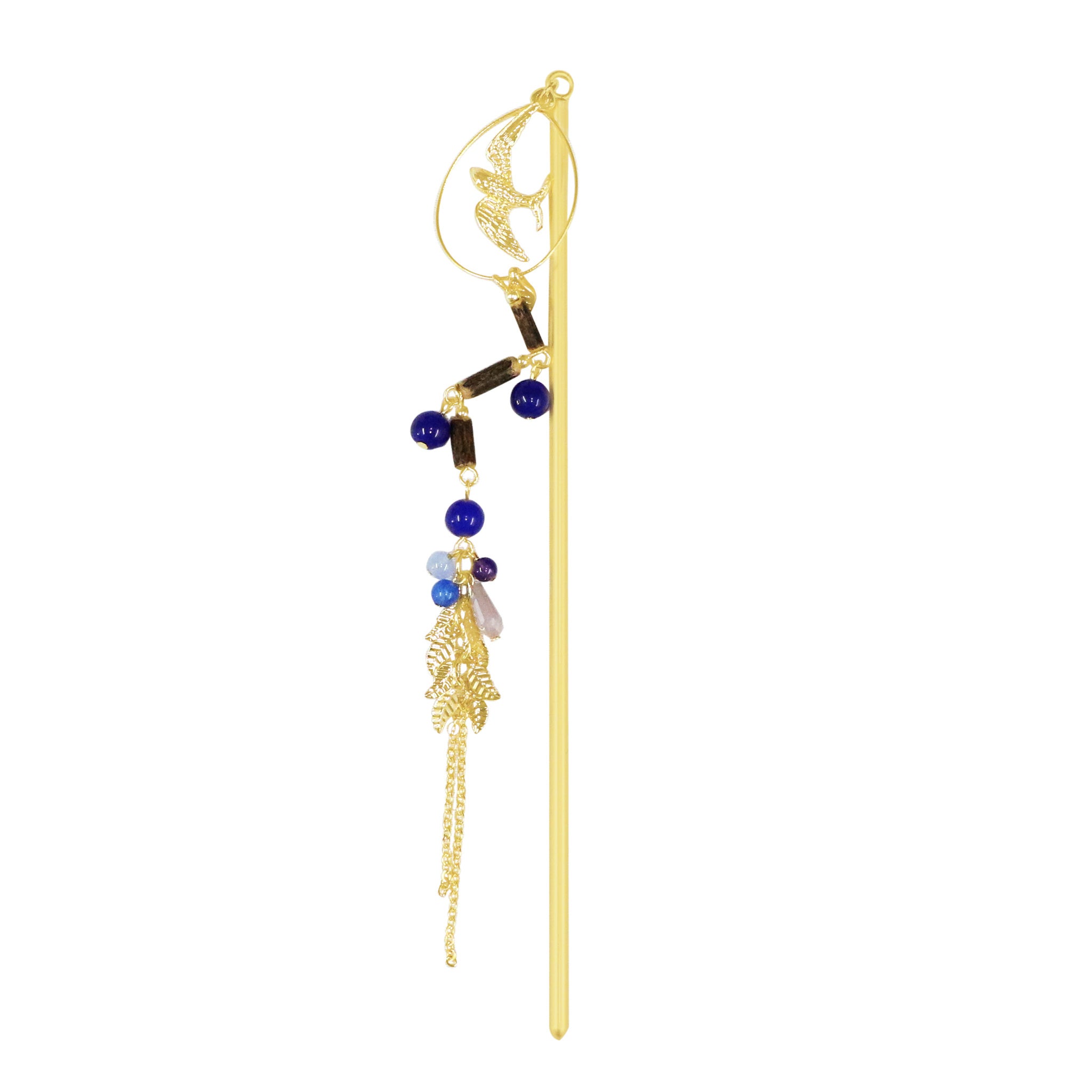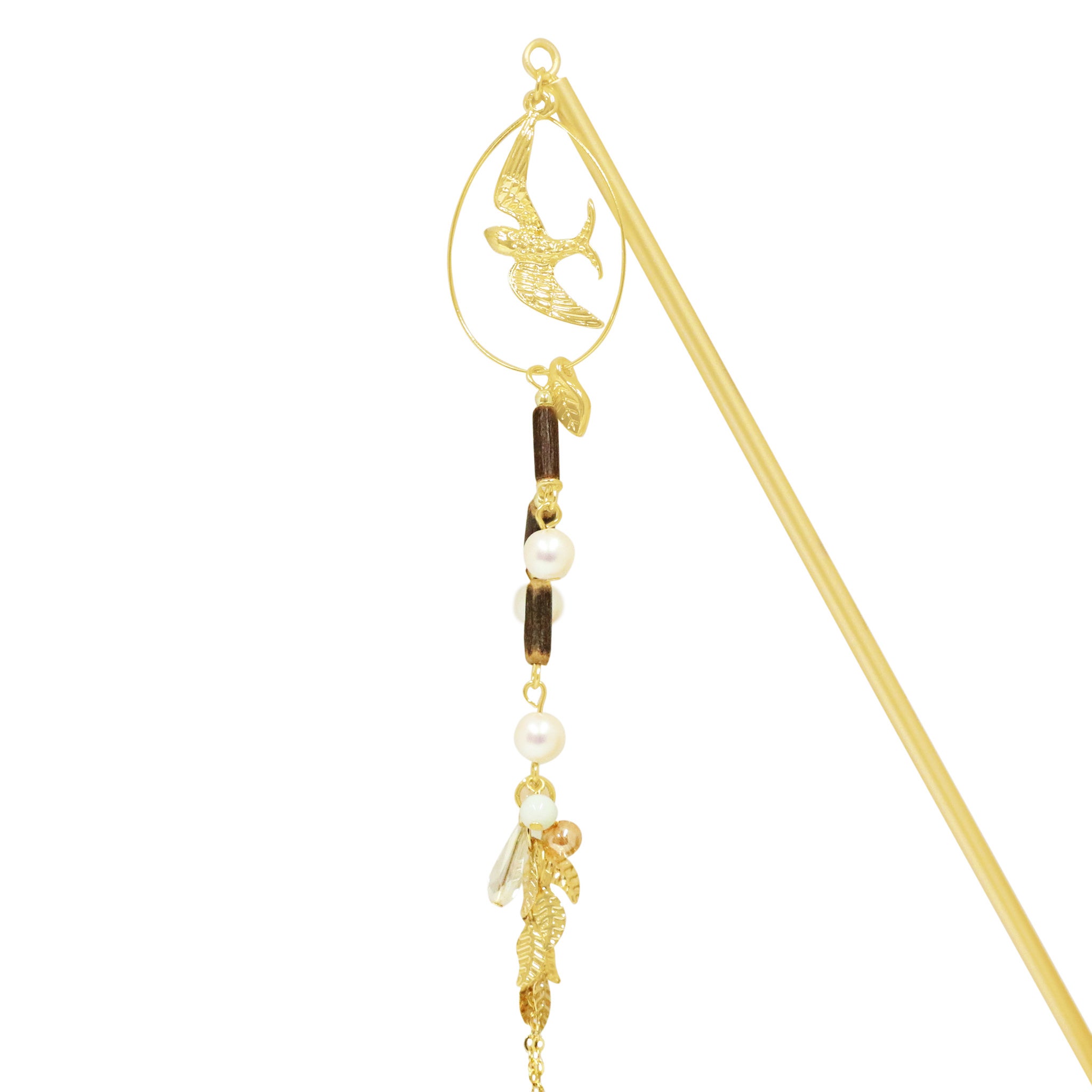 広大な森を抜け、次なる目的地へと羽ばたく渡り鳥をモチーフにした簪が登場。フープの中で翼を広げるツバメは自由の象徴。連なる木製ビーズは深い森を、艶やかな丸ビーズは旅の中で見つけた森の恵みを表現しています。
