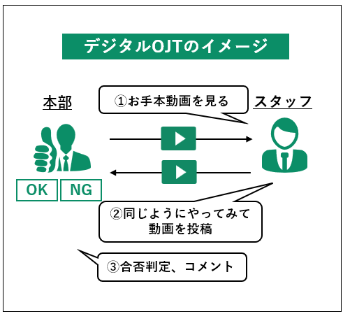 これまでは対面OJTで教えていた内容ですが、動画を見て学習する自律型OJTに置き換えます。