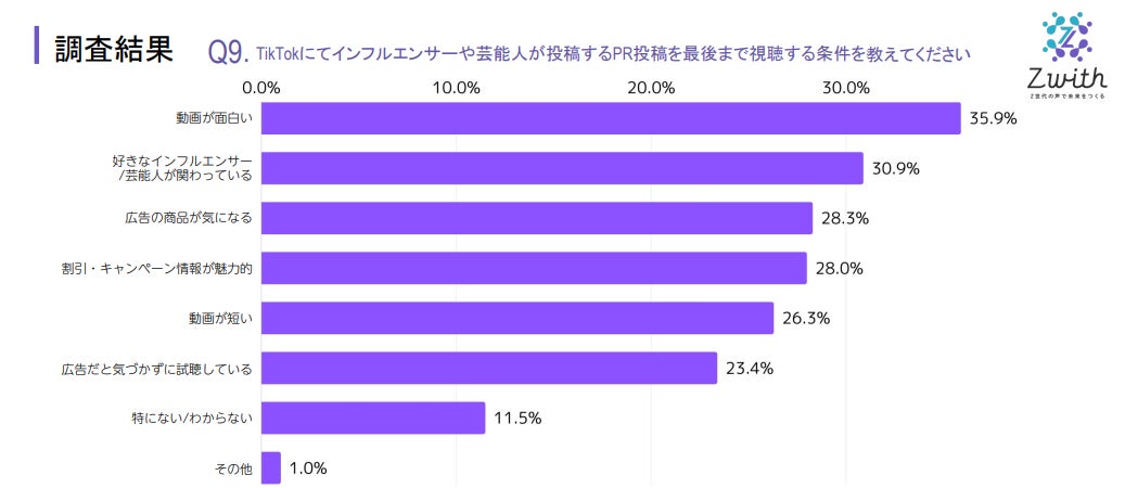 ◆TikTokでインフルエンサーや芸能人のPR投稿を最後まで視聴する条件は「動画が面白いかどうか」という回答が最も多い結果に