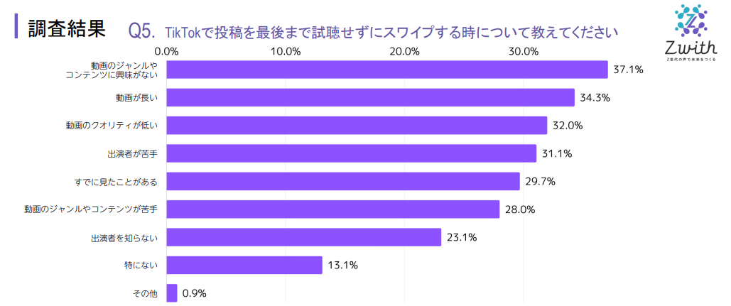 ◆TikTokで投稿を最後まで視聴せずにスワイプする理由の1位は「動画のジャンルやコンテンツに興味がない」から