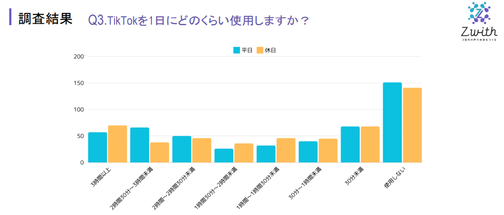 TikTokを情報を得るためのメインメディアとして使用している人数は多くはなかったですが、1日で2時間30分以上TikTokを使用すると答えたグループは全体の約4割に達しました。