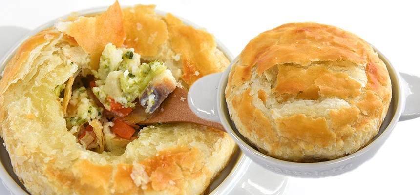 真鱈と彩り鮮やかな野菜を使ったシチューパイです。にんじんやブロッコリーなど具だくさんの具材とミルクの香りが食欲をそそる一品です。(内容量:180g、サイズ:直径約11cm×高さ3cm、価格:2,200円(税込)、原産国名:日本)