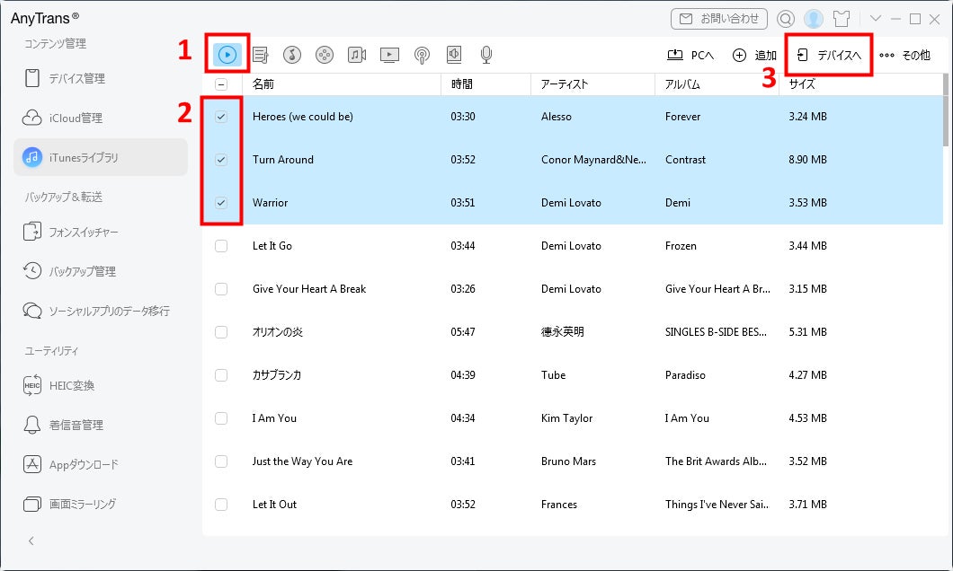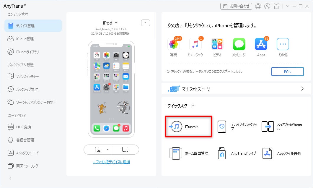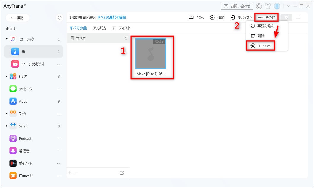 Step 1:AnyTransをパソコンにダウンロード、起動します。iPodをUSBケーブルでパソコンに接続し、ホーム画面から「ミュージック」を選択します。iTunesへ移したい曲を選択して、「その他」から 「iTunesへ」をクリックし、iPodの曲がiTunesにコピーされます。