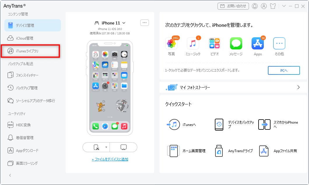 2.左のメニューバーから「iTunesライブラリー」を選択してクリックします。