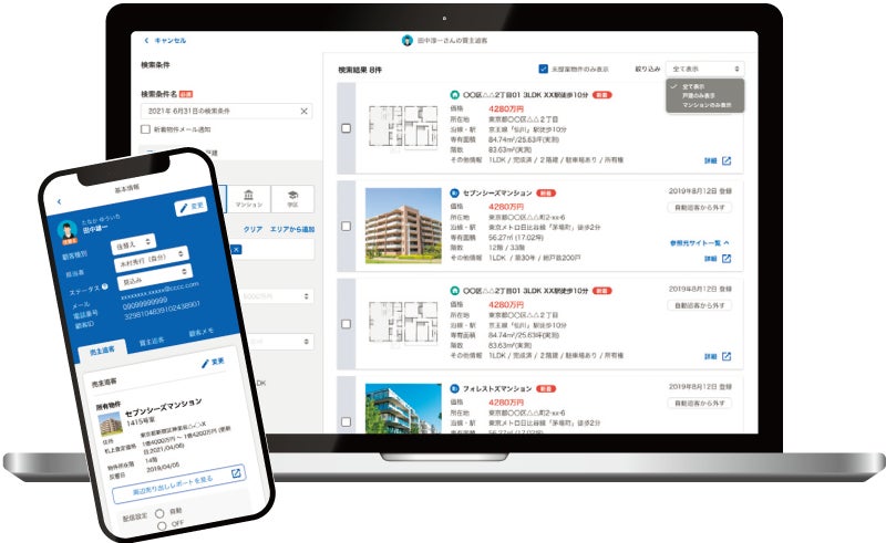 SaaS型のため、PCやスマートフォンでいつでも利用可能です。また、顧客管理や物件検索、優先して対応すべき顧客のリスト化など、営業活動に必要な各種機能を備えているため、「プロポクラウド」1つで不動産売買営業のDXを実現することができます。