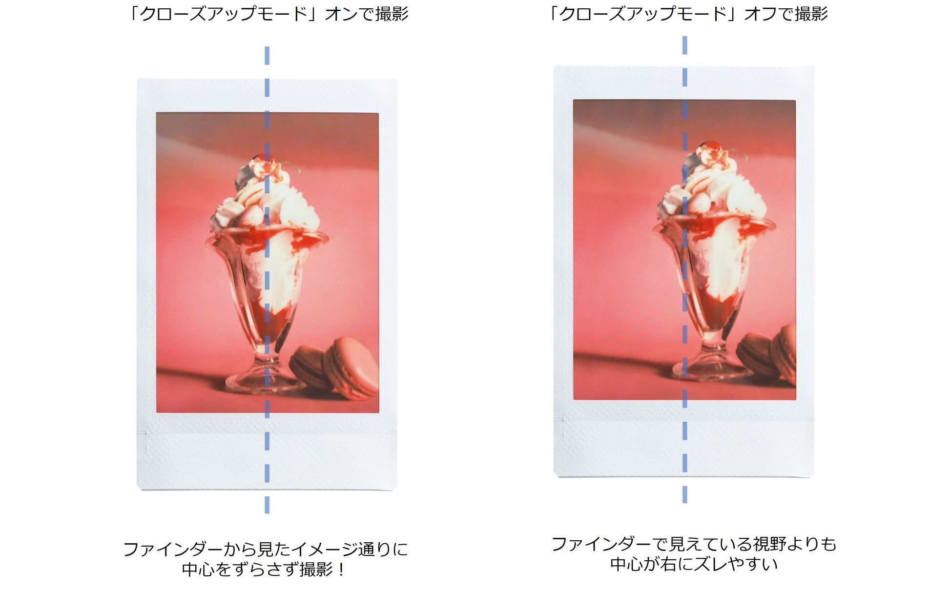 ・接写の際にファインダーから見える視野を、実際のプリントに写る範囲に合わせる機能(パララックス補正)をエントリーモデルに初めて搭載。ファインダーでとらえた中心をずらさず、接写を簡単に楽しめます。