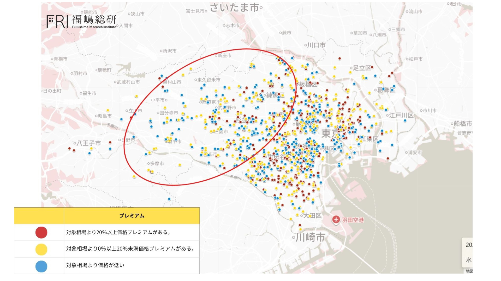 価格差は三段階に分類しました。対象相場に対して20%以上の価格プレミアムがあるものを「赤色プロット」、0%以上20%未満のプレミアムがあるものを「黄色プロット」、対象相場を下回るものを「青色プロット」として地図上に落とし込み、エリア特性との関係を分析しました。