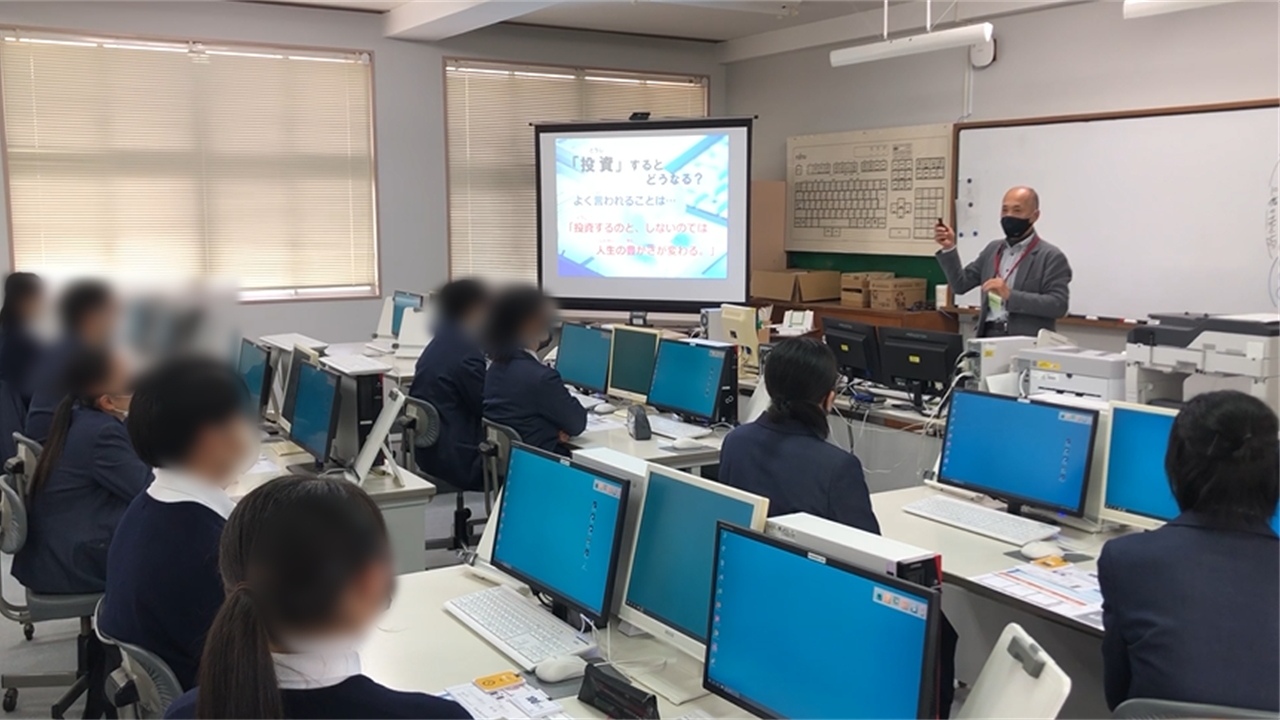 2023年1月23日(月)の研究授業は、高校2年生を対象に「投資」のテーマで実施しました。本テーマは、生徒自身が経営者となり、自分の工場の機械や人材・施設への投資によって工場レベルを上げながら、生産できる商品を増やすことで、売上アップを目指すゲームです。また、途中で好景気やストライキなど、様々なイベントが発生するので、こうした現象が経済的にどんな影響を与えるのかを体感しながら理解することができます。さらに、ゲーム終了後には、“投資”についてのレクチャーを実施し、金融投資に留まらず、自己投資や日頃の生活、家庭に結び付いていることへの理解を促します。
