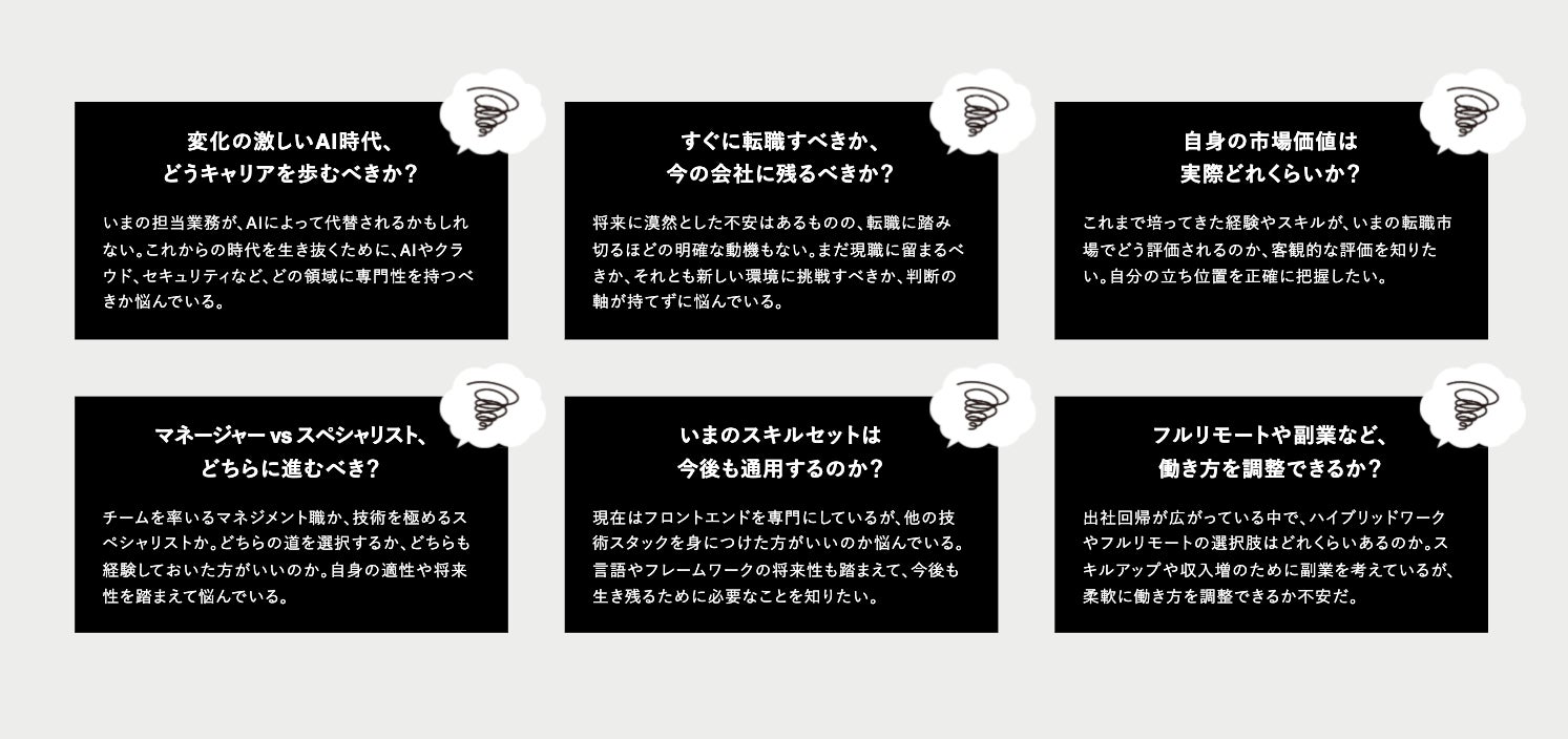 キャリアアドバイザーが実施する「キャリアの壁打ち」では、ITエンジニアが抱える以下のような悩みや「業務を通じてどのような生き方をしたいか」をヒアリングし、キャリア観を客観的に把握・分析します。ヒアリングした内容について、転職ドラフトが持つ独自のフレームワークを用いて、相談者それぞれに合わせたキャリアシート(Your Core Values)を作成します。