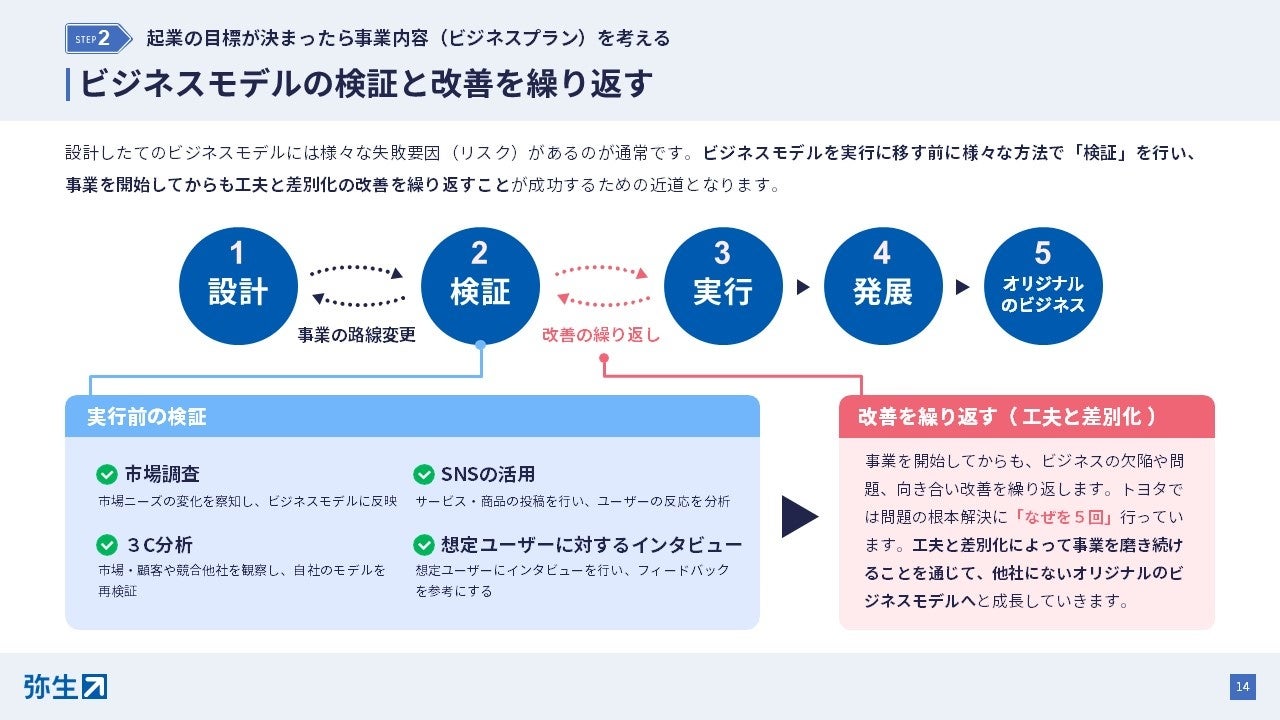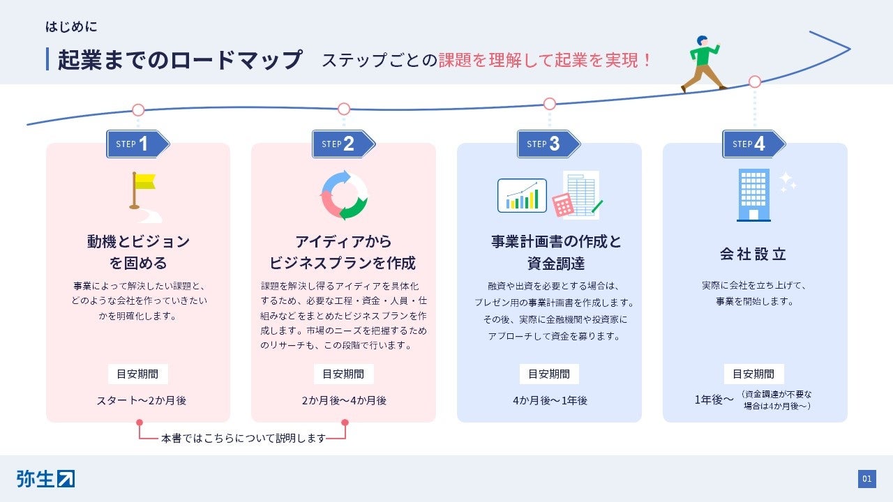 弥生では、スモールビジネスの立ち上げから発展の過程で直面するあらゆる課題を解決するサービスを提供しています。起業・開業領域においては、2021年より疑問や不安を5つのステージに分けて解説する「起業・開業ナビなど支援サービスの提供をしてまいりました。今回、特につまずきやすい「起業の準備・基礎知識」「事業計画の作成・資金調達」「会社設立」について、具体的に手順を追いながら理解することのできるお役立ち資料を公開します。