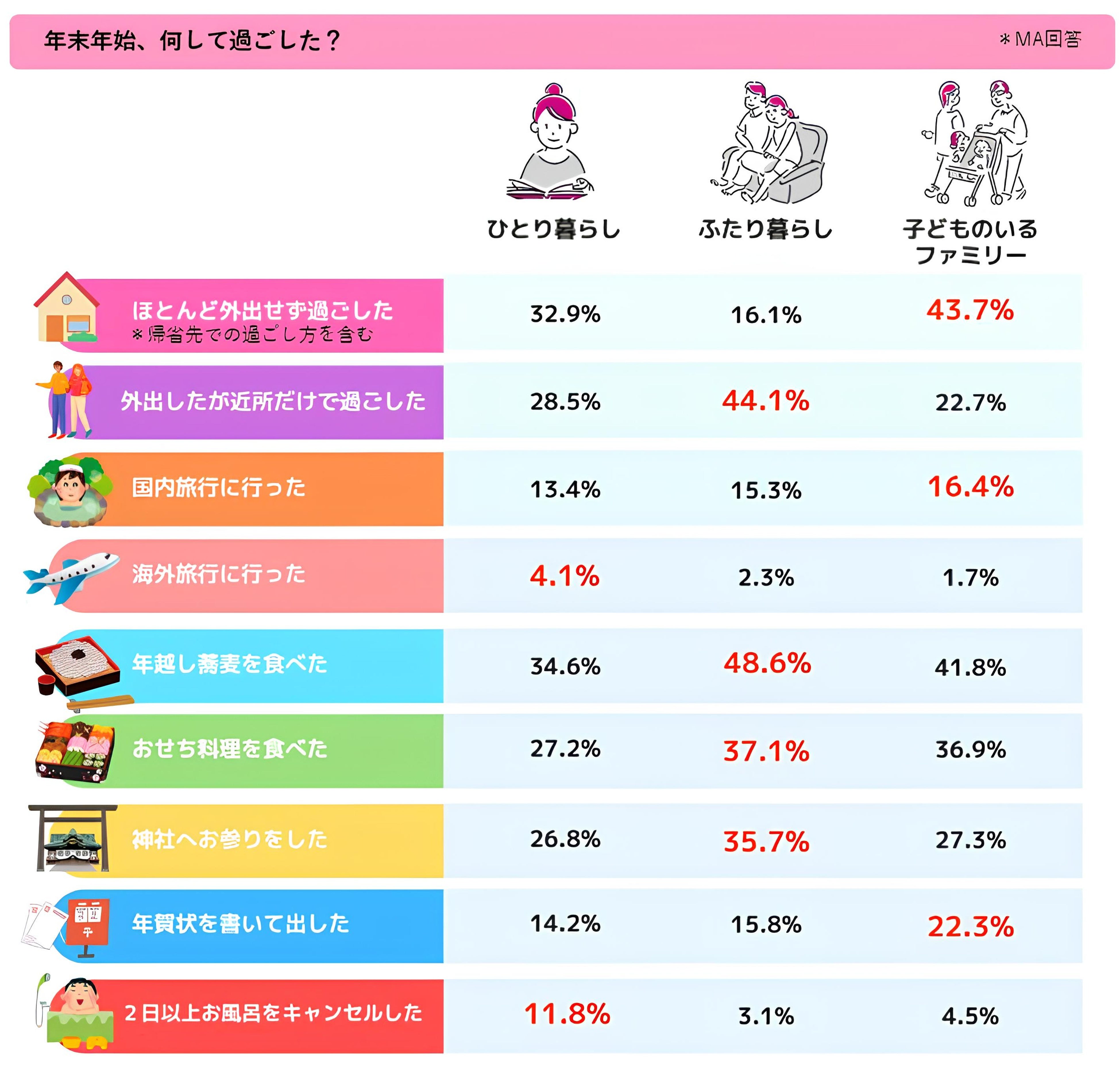 ファミリーは「慣習での日帰り派」、ひとり暮らしは「交流の長期滞在派」で二極化。年末年始の過ごし方では旅行よりも「自宅完結」が主流に。