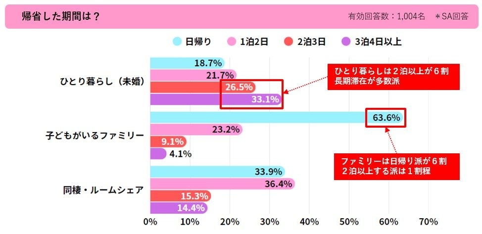 最も帰省率が高く、ひとり暮らしでは40代から大きく帰省率が低くなるのも特徴的でした。帰省期間についても、ファミリーでは日帰りが6割以上と主流である一方、ひとり暮らしでは2泊以上が6割となり、実家への帰省を“家族や地域の慣習”として捉えているファミリーに対して、ひとり暮らしでは“家族や友人・知人との時間を楽しむ”という個人的な思いが垣間見える結果となりました。