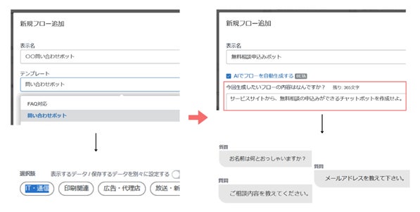 これまでの『IZANAI』は、使用目的ごとに設定されたテンプレートを選択し、会話フローを手軽に作成することが可能でしたが、テンプレートの不要な質問を削除するなどの編集が必要でした。ChatGPTとの連携により、必要な質問項目を予め選択し、対応する会話フローが自動作成されるようになるため、理想的な会話フローをより簡単に設定することができるようになります。