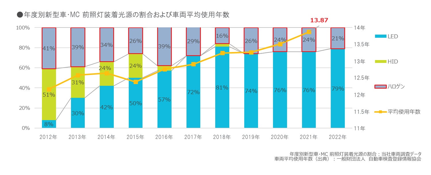 現在、新車ではハロゲンバルブの採用が減少しつつあります。しかし、車の使用年数が長期化していること(下グラフ)や近年の新車供給不足による中古車人気から、ハロゲンバルブ装着車は未だに多いと考えられます。また、そのことから、補修用や明るさ・視認性の向上を目的とした、LEDバルブへの交換需要が存在すると想定されます。