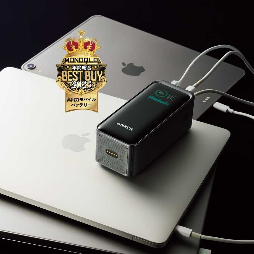 20000mAhの容量と最大200Wの出力を有するハイスペックモデルで、USB‐Aが1口、USB‐Cが2口のマルチポートを備えています。高評価だったのは、同時充電の際の出力の安定性。3口あるポートで同時出力しても、ほぼ変わらない出力のままという驚異のパワーでした。ボディのディスプレイに映し出されるバッテリー残量や充電可能時間などのリアルタイム情報も超便利。外出や出張の多いビジネスパーソン、クリエイターでも、このモバイルバッテリーを一台持っていれば安心です。